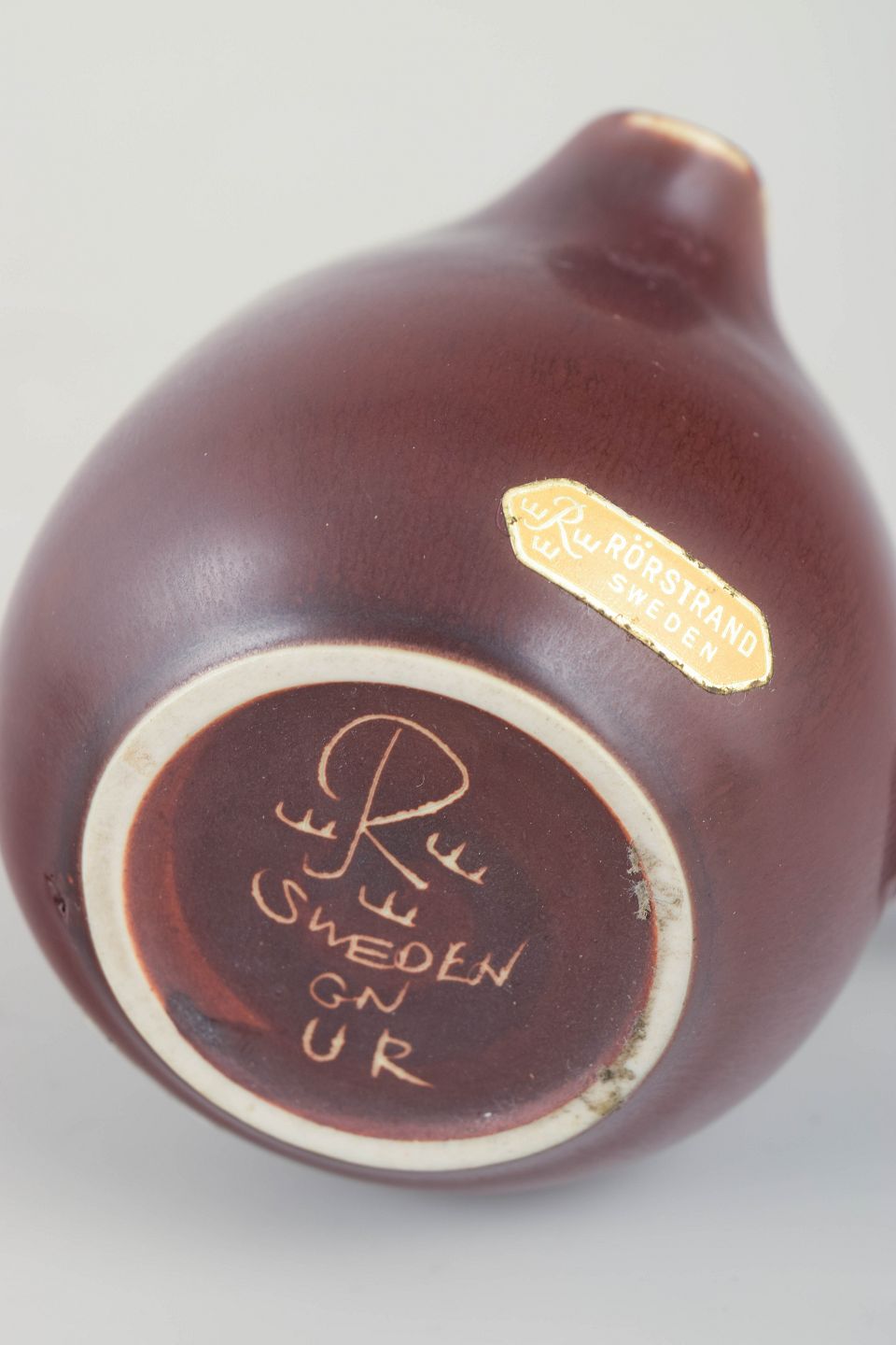 Gunnar Nylund var en af de mest betydningsfulde formgivere hos Rörstrand i det 20. århundrede. Hans design kombinerer funktionalitet med skulpturel elegance, ofte udført i matte, dybe glasurer. Flødekander og små brugsting som denne viser hans sans for proportioner og hans evne til at skabe hverdagsobjekter med kunstnerisk nærvær.
