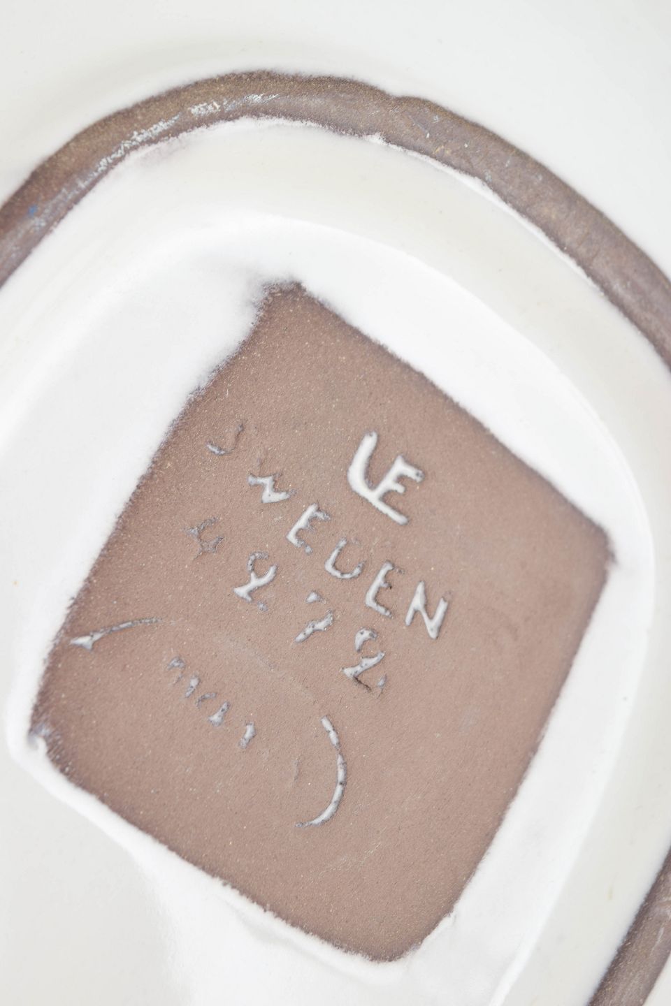 Meget stor, bladformet keramikskål dekoreret med Simmulsons karakteristiske indridset mønster i lyse toner mod brun baggrund. Håndmalet og elegant udformet med organiske linjer.