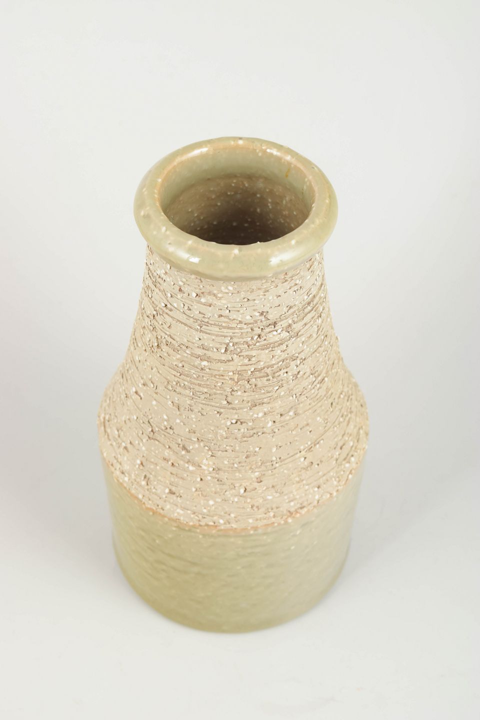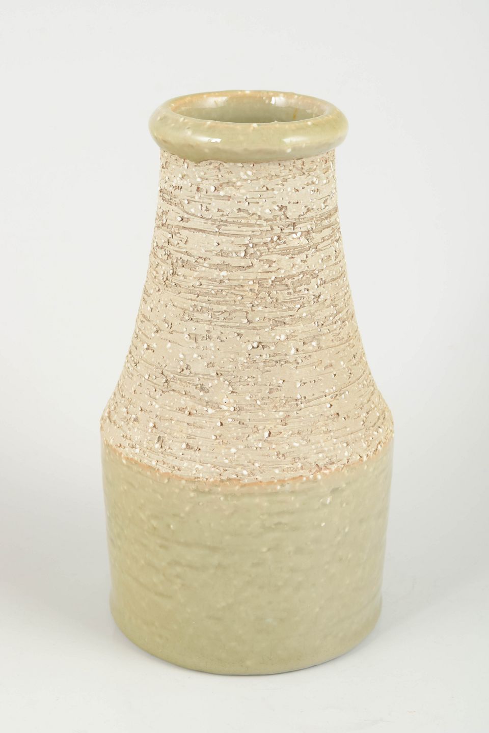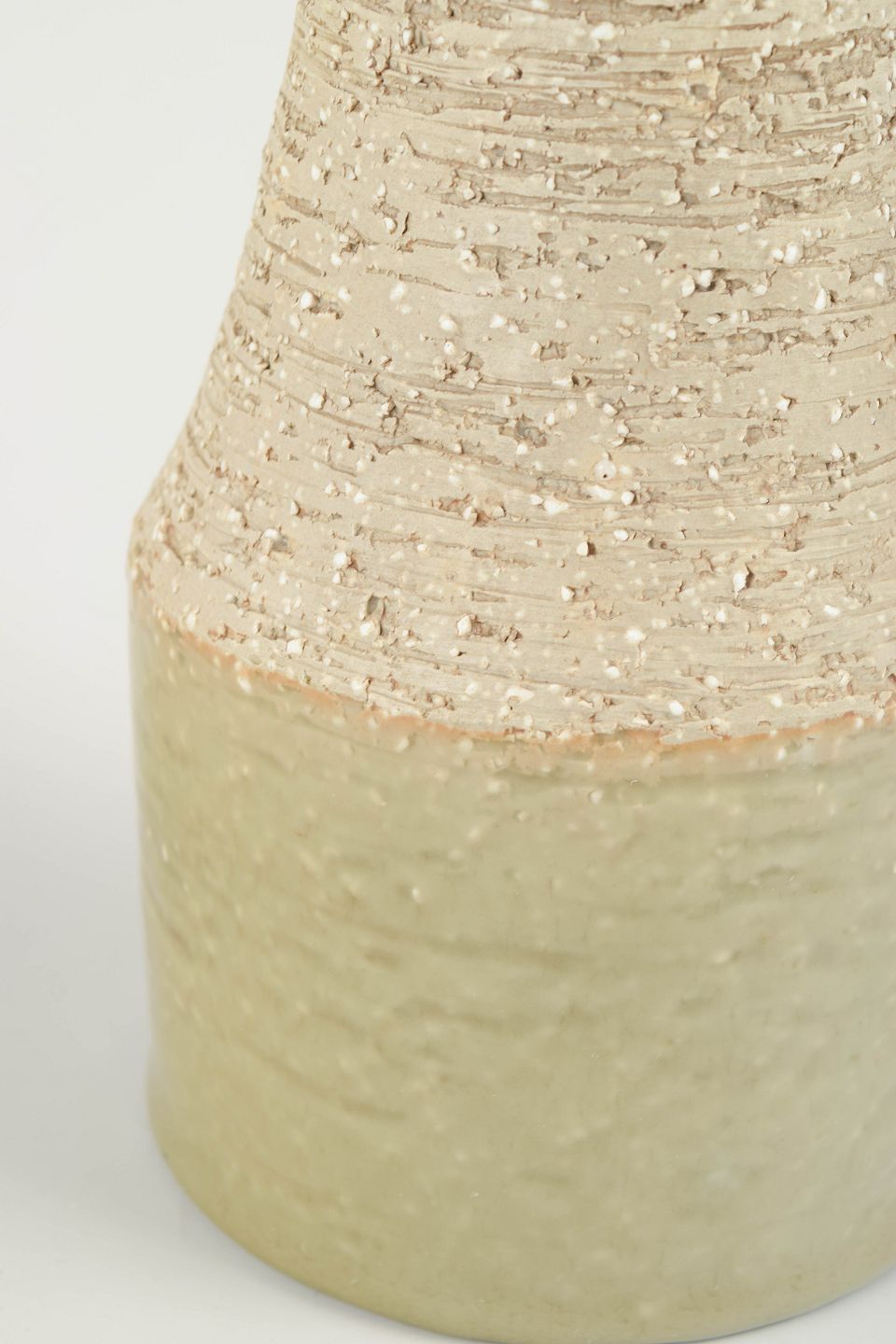 Cylindrisk vase i stentøj med kombination af glaseret og uglaseret overflade. Den øverste del har en rå, taktil struktur, mens den nederste del er glaseret i en lys beige/grønlig tone.