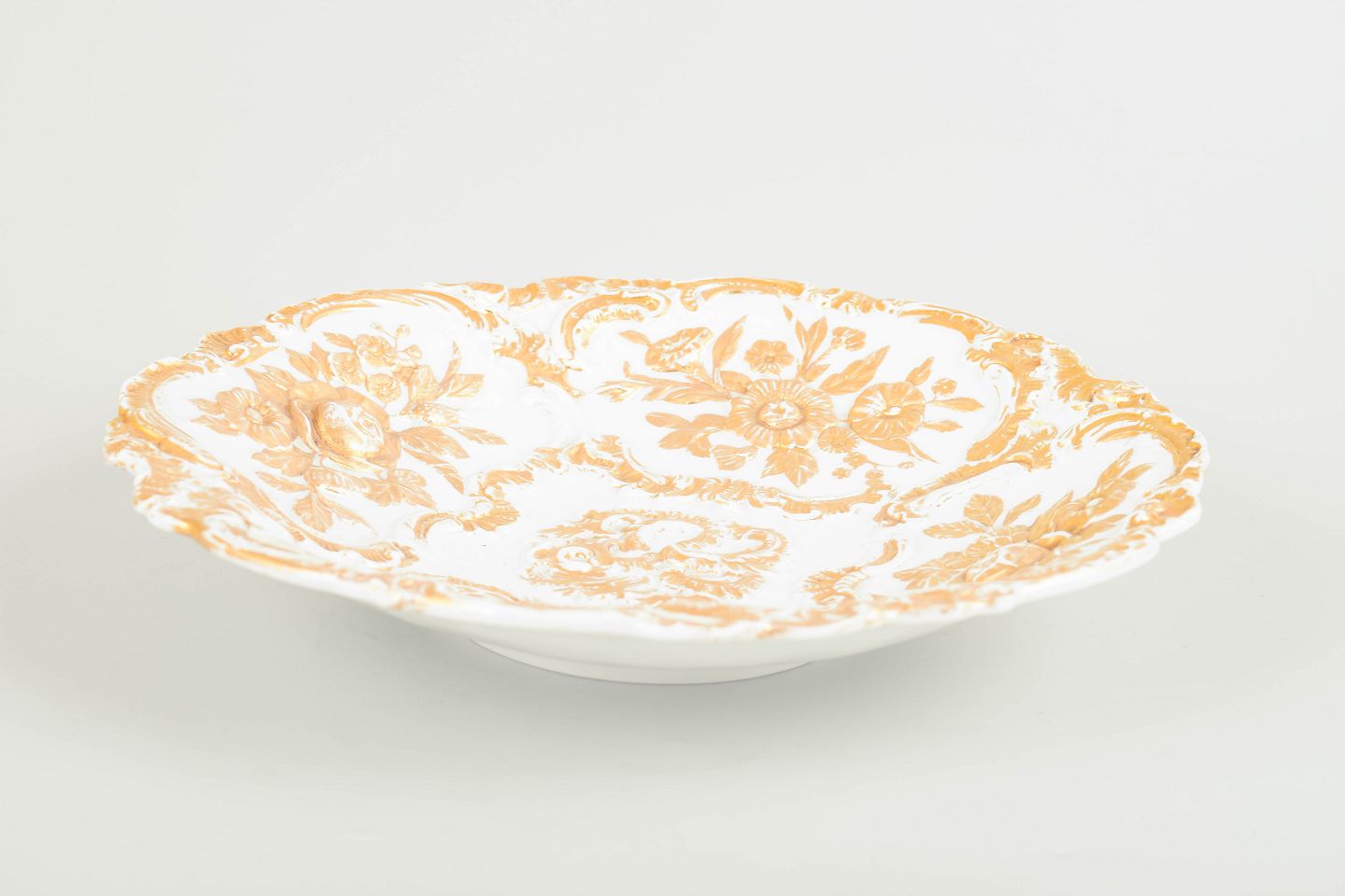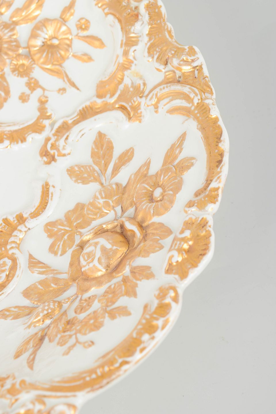 Stort og dekorativt porcelænsfad fra Meissen, rigt udsmykket med håndmalet guldbemaling og detaljeret relief i rokokostil. De kraftige blomster- og rocaillerelieffer giver fadet et luksuriøst og tidstypisk udtryk fra det sene 1800-tal.