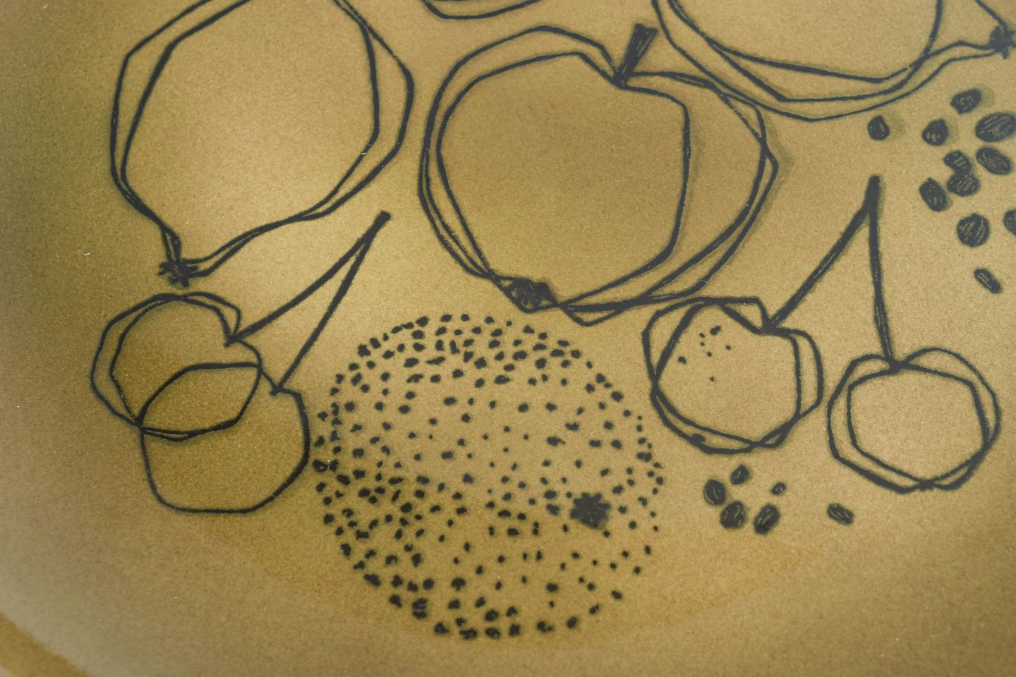 Keramisk fad med grafisk frugtmotiv i sort på sennepsgul glasur – et karakteristisk eksempel på Olin-Grönqvists enkle, legende streg og Arabia-fabrikkens dekorative design fra perioden.