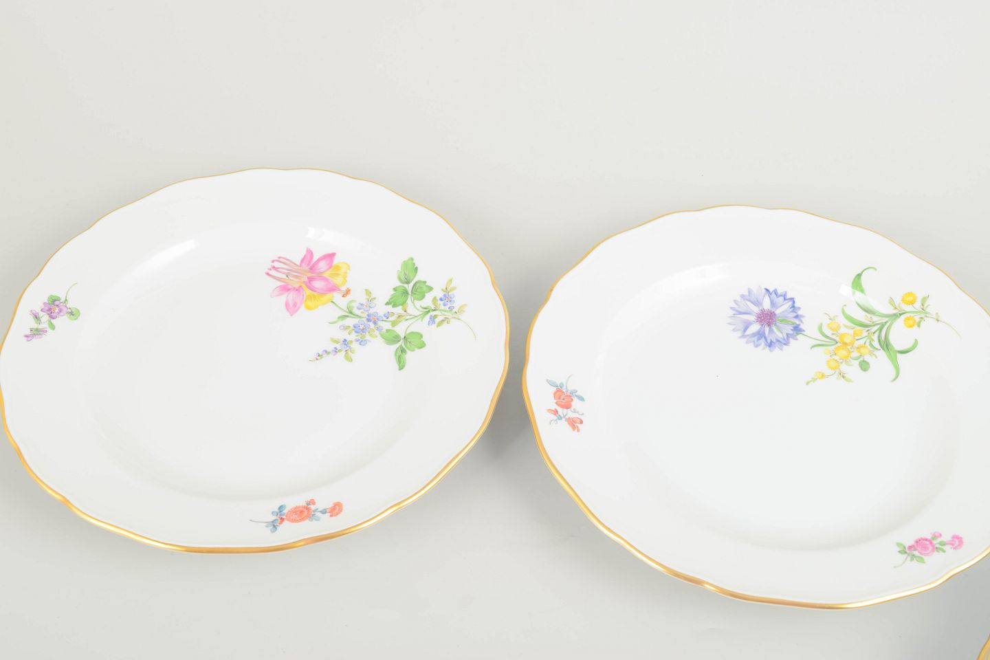 Meissen, grundlagt i 1710, var Europas første hårdporcelænsfabrik og satte standarden for håndmalet porcelæn gennem hele 1700- og 1800-tallet. Blomsterdekorationer – særligt de naturalistiske buketter – var blandt manufakturens mest efterspurgte motiver. Meissens arbejde fra slutningen af 1800-tallet er kendetegnet ved detaljerigdom, teknisk perfektion og en fortsat fastholdt tradition for forgyldte rande og klassiske former.