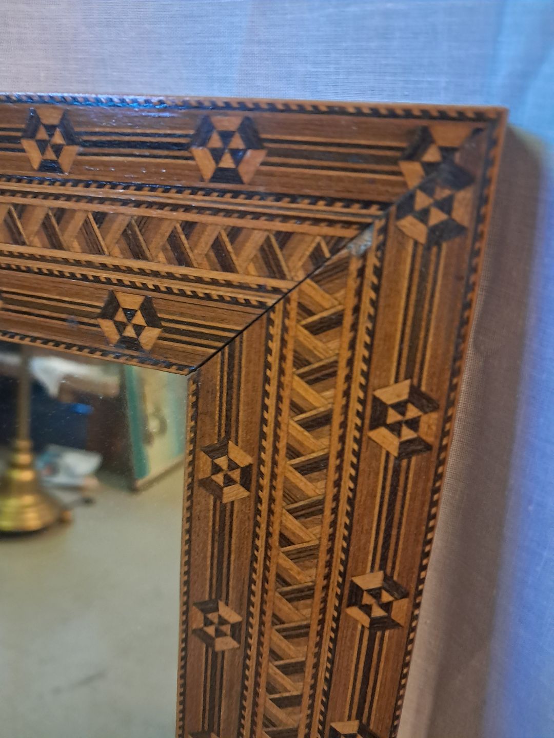 Spejl i fineret mahogni med intarsia, fra 1950erne.