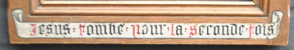 Religiøs ramme i egetræ, 19. årh. Danmark. Med fransk tekst: Jesus rombe pour la seconde Fois. (Jesus falder for anden gang). Foroven kors og romertal: X. 58 x 46 cm.