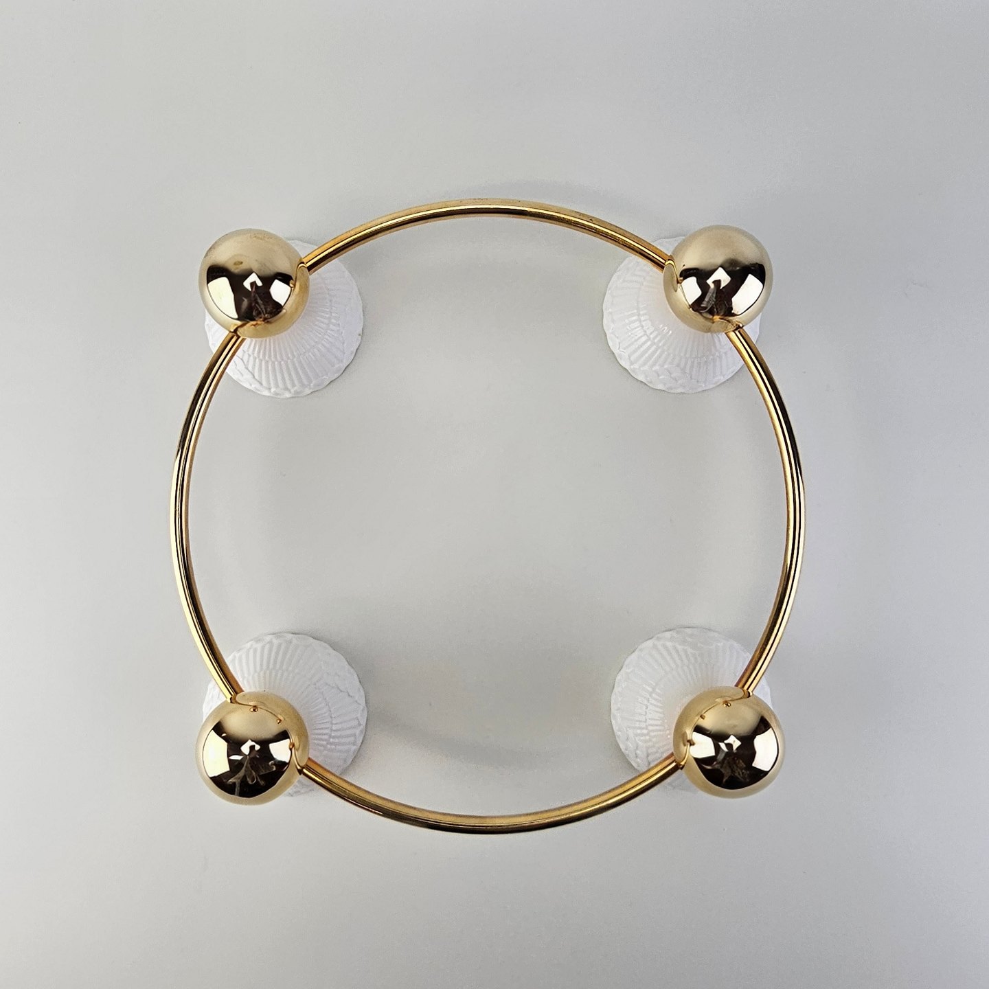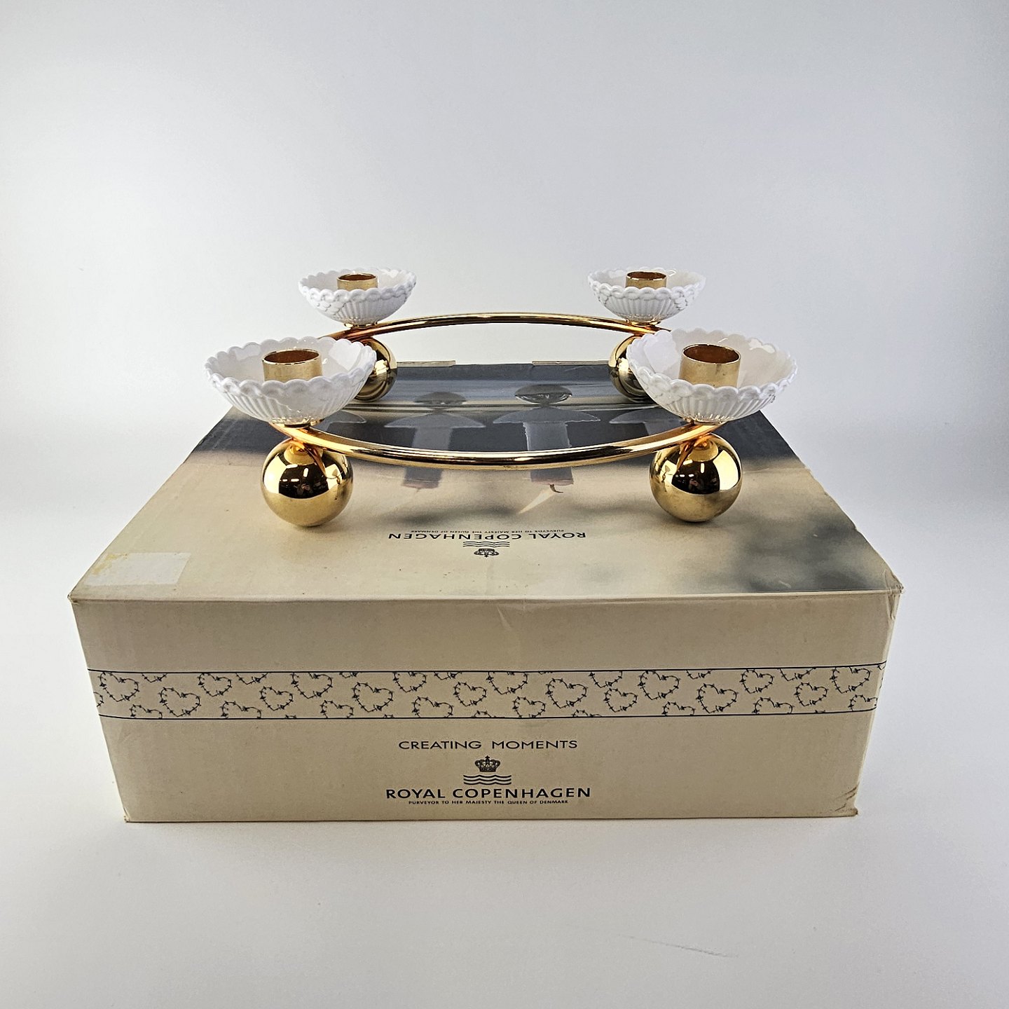 Rund lysestage i forgyldt messing med plads til fire lys i små hvide skåle af kongeligt porcelæn. Stagen er fra serien Creating Moments og kommer i original kasse