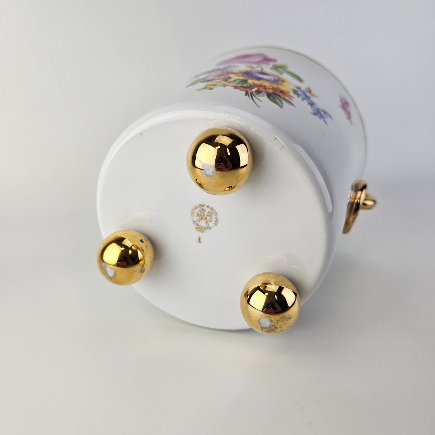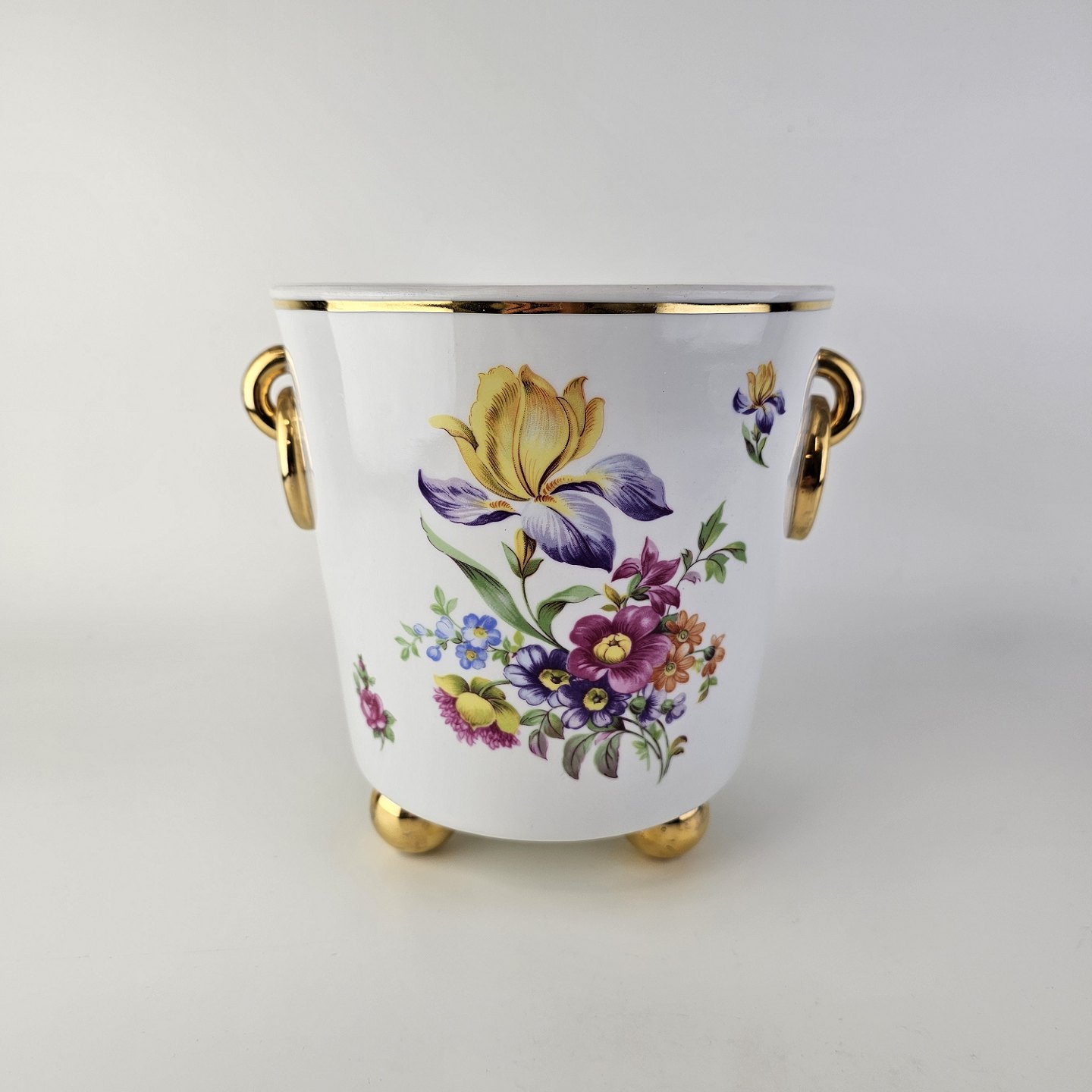 Urtepotteskjuler i porcelæn med farverigt blomstermotiv med tre guldbelagt kuglefødder og to guldbelagt hanke,