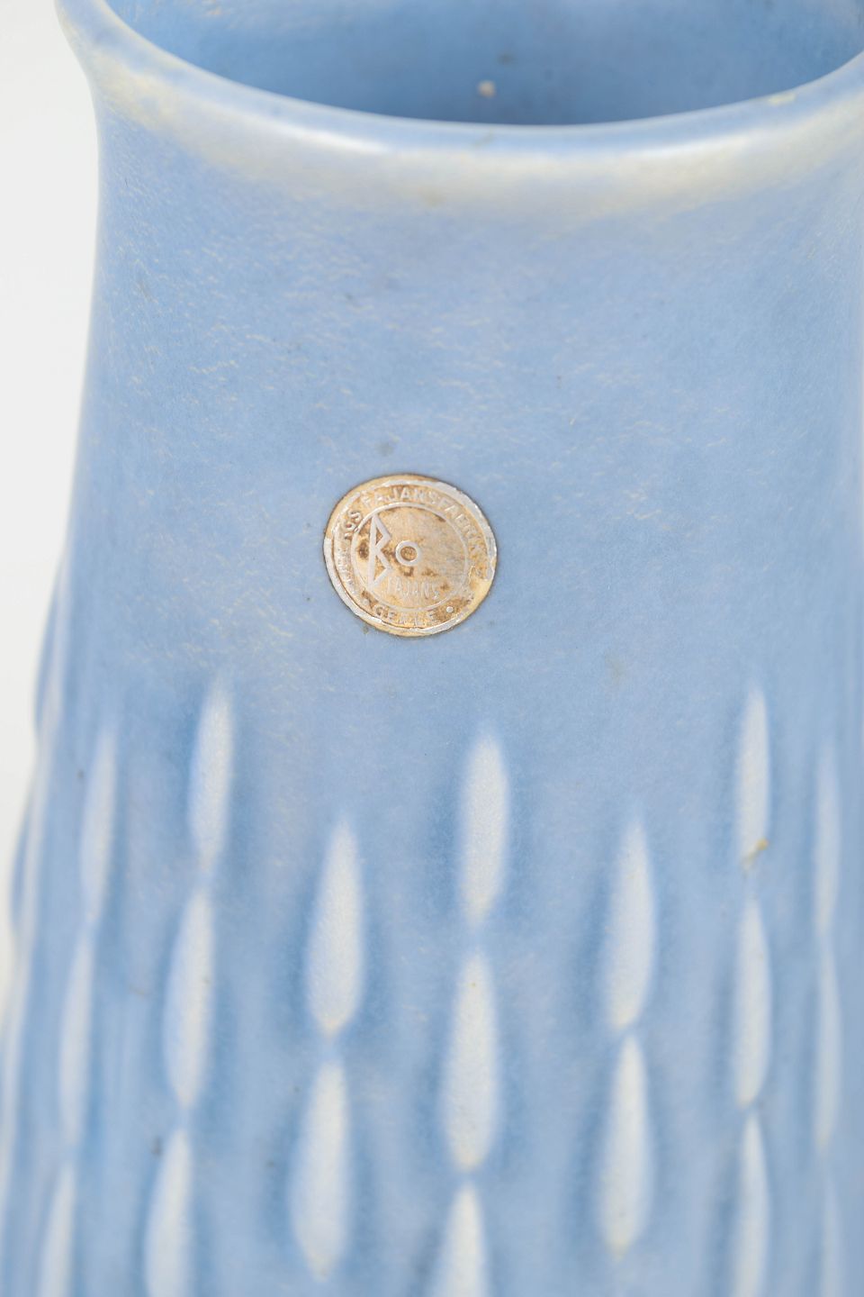 Håndlavet fajancevase i lyseblå glasur med reliefdekoration og original Bo Fajans-etiket bevaret. Model D382. Elegant cylinderisk form med organiske, dråbeinspirerede vertikale mønstre.