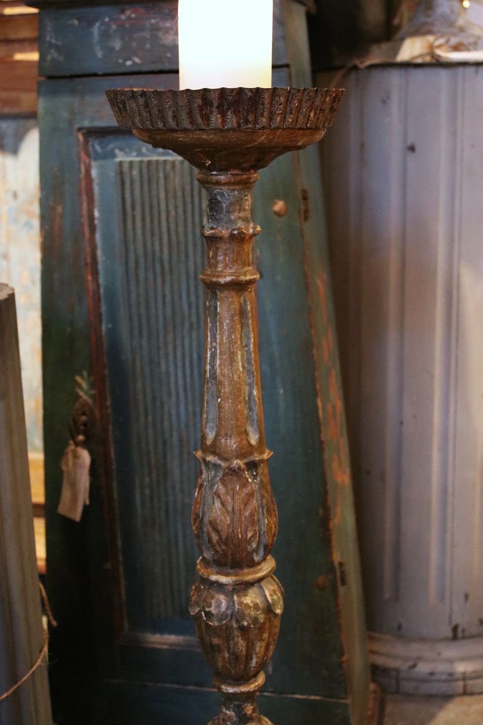 Antik , fransk 1800 tals gulv lysestage i udskåret træ med original bemaling...