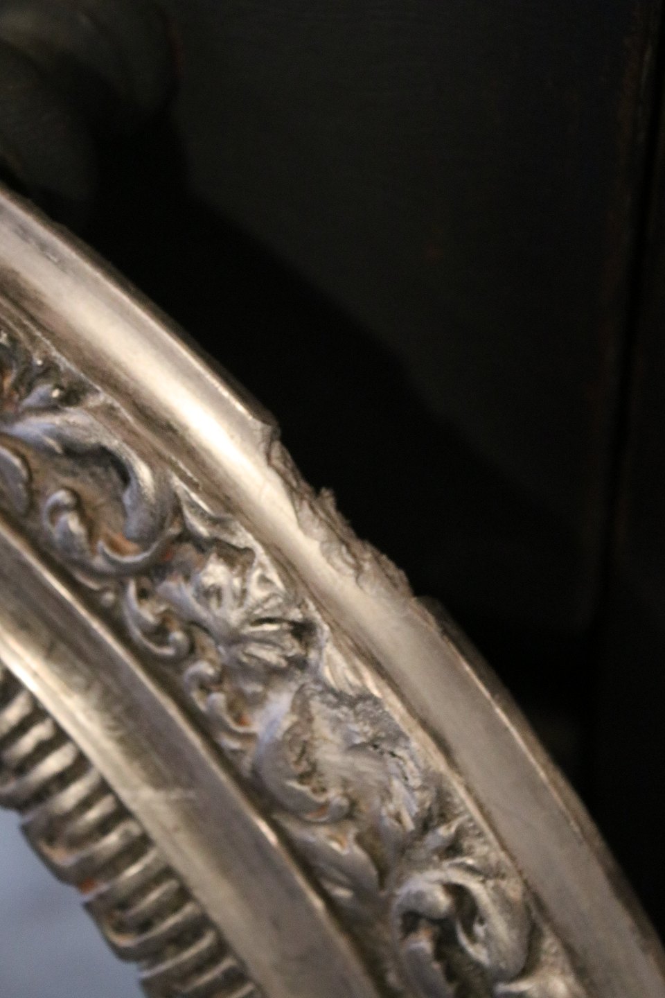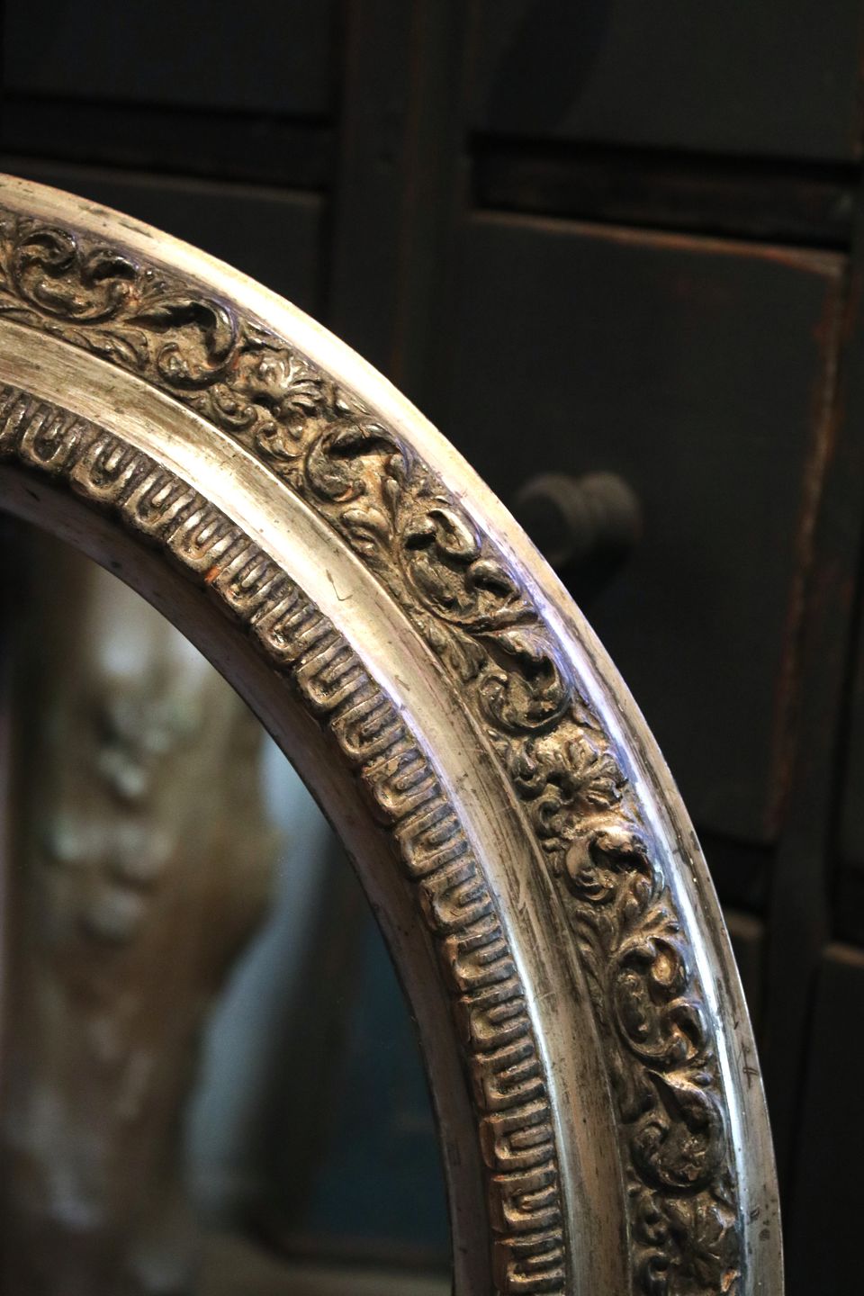 Gammelt fransk ovalt spejl med fin dekoreret bred forsølvet træ ramme med bladranke. Spejlet har en fin patina og har et par mindre kantafslag på rammen. Måler: 55x47cm.