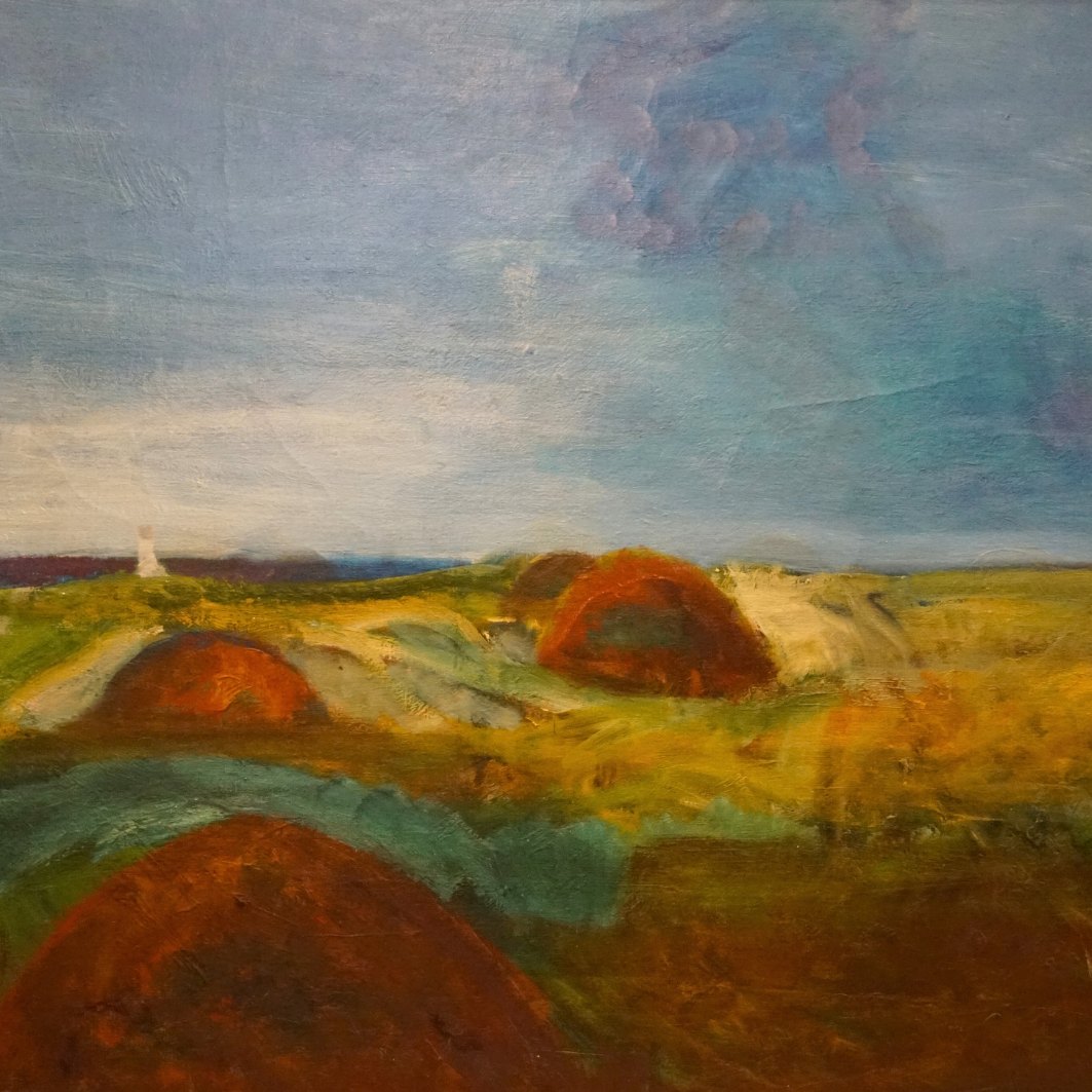 Jens Søndergaard; Landskabsmaleri med marker i forgrunden, samt tårn og hav i baggrunden. Olie på lærred.