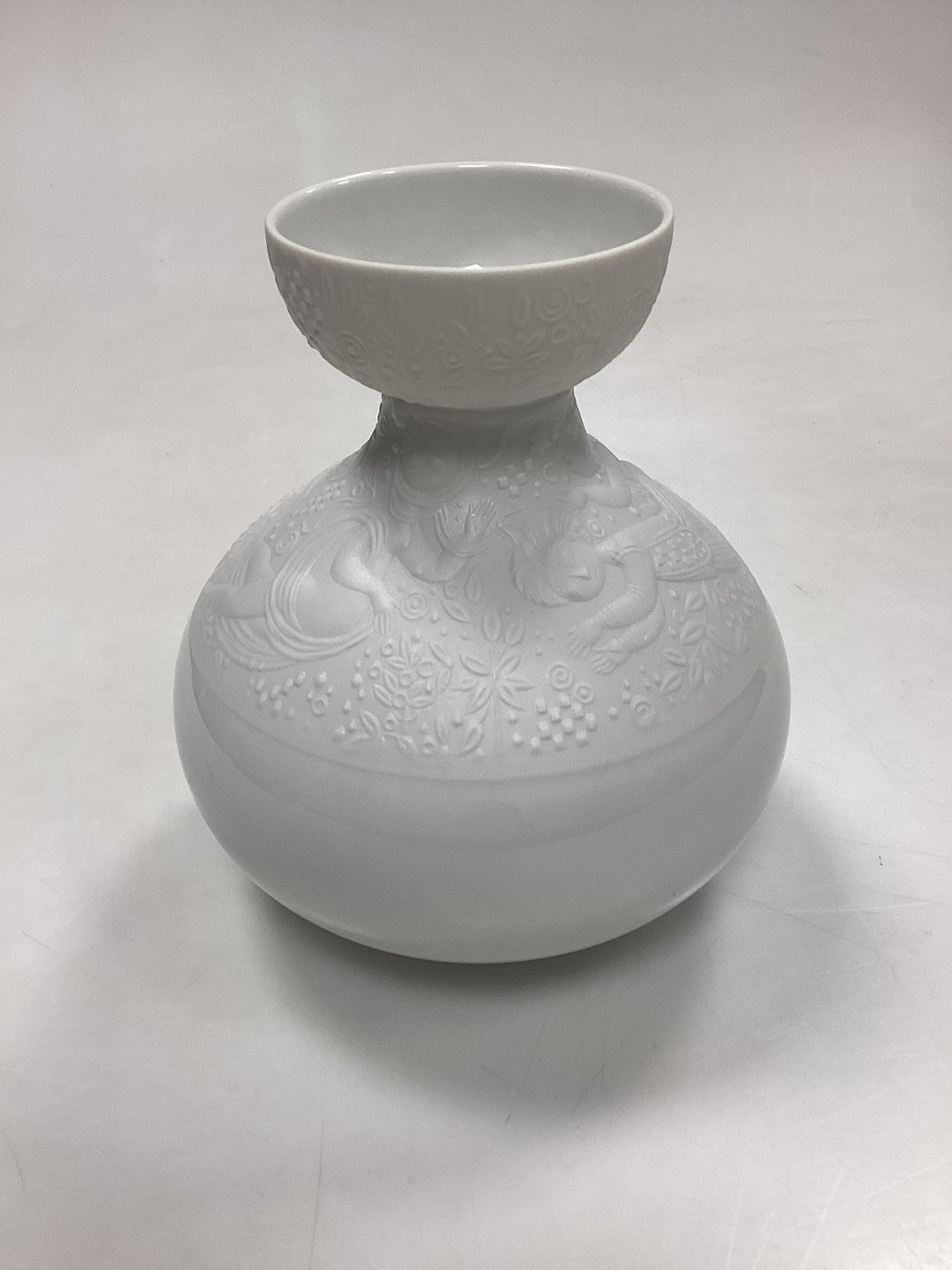 Rosenthal Bjørn Wiinblad Tryllefløjten Vase. Glat porcelæn med motiv i ophøjet relief. Måler 14,2 cm / 5,59 in.