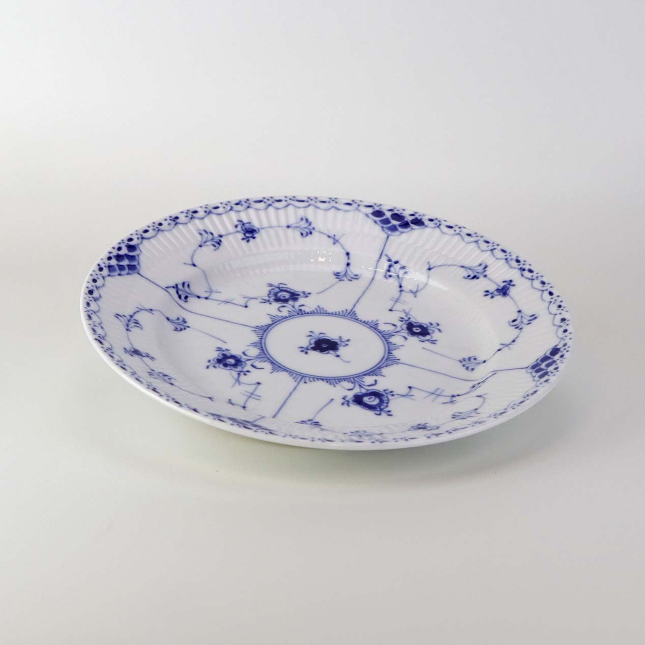 Stor desserttallerken i kongeligt porcelæn fra stellet Musselmalet Halvblonde. Nr. 1/573