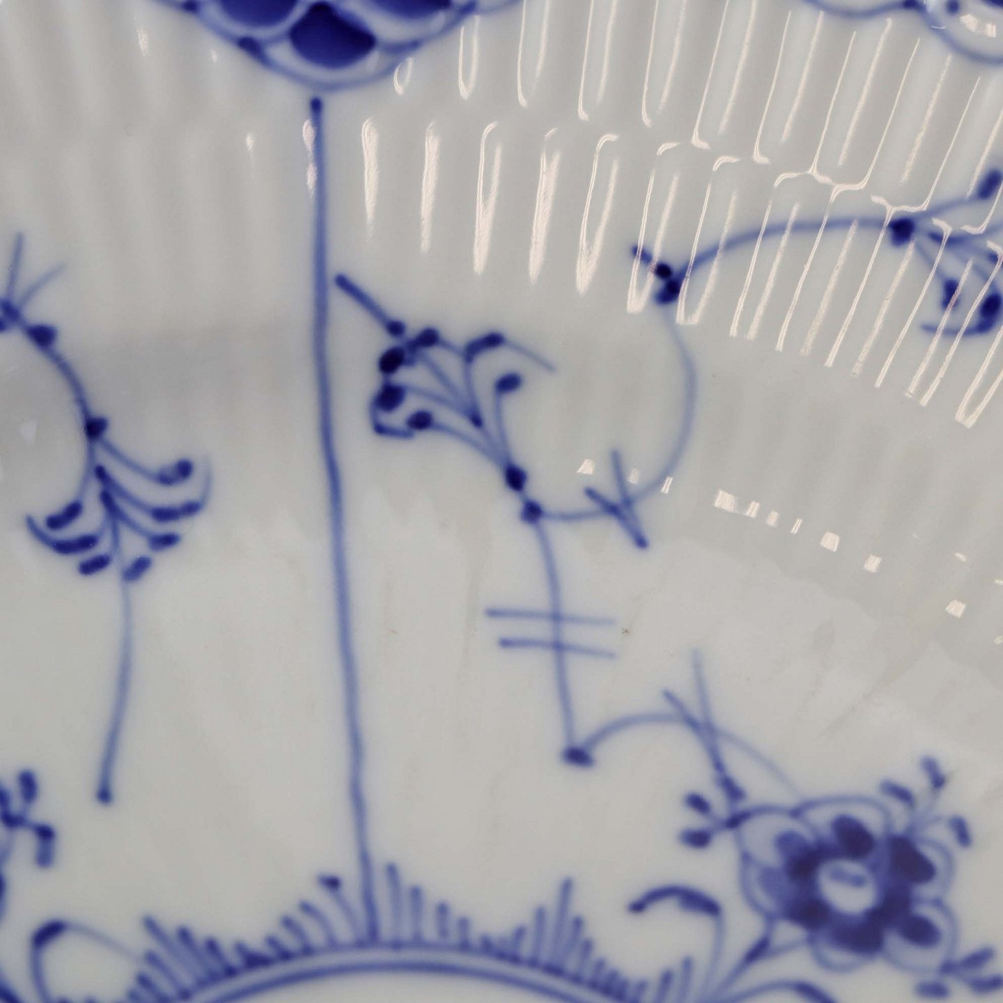 Musselmalet halvblonde er riflet hvidt porcelæn med dekoration af blå ranker og en kant med blonder.