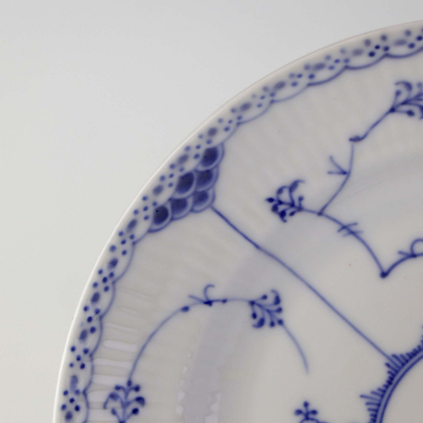 Musselmalet halvblonde er riflet hvidt porcelæn med dekoration af blå ranker og en kant med blonder.