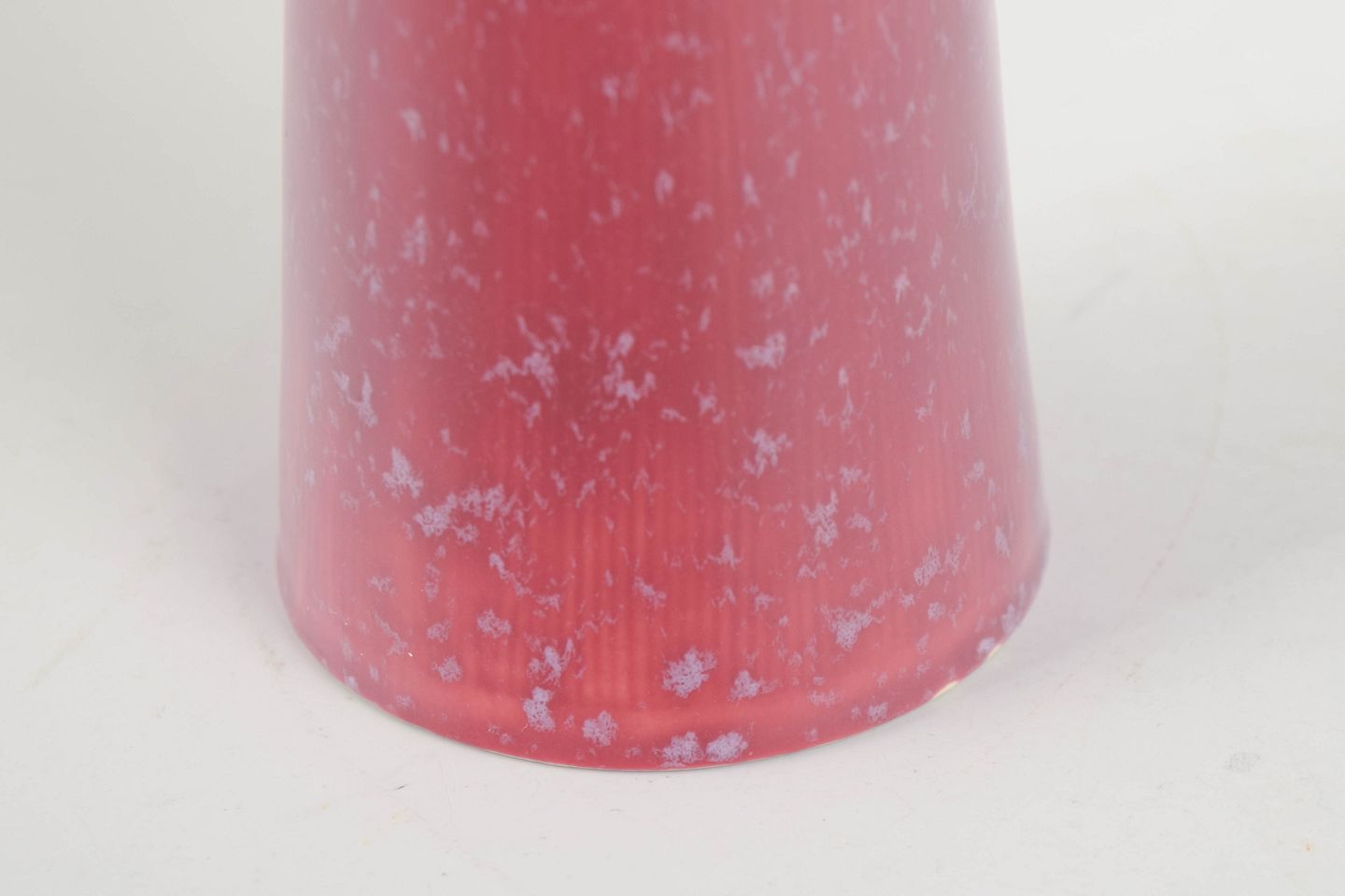 Sjælden pokalformet skål i rød glasur med blålige spejlinger, elegant høj fod og glat, afrundet form. Uden signatur.