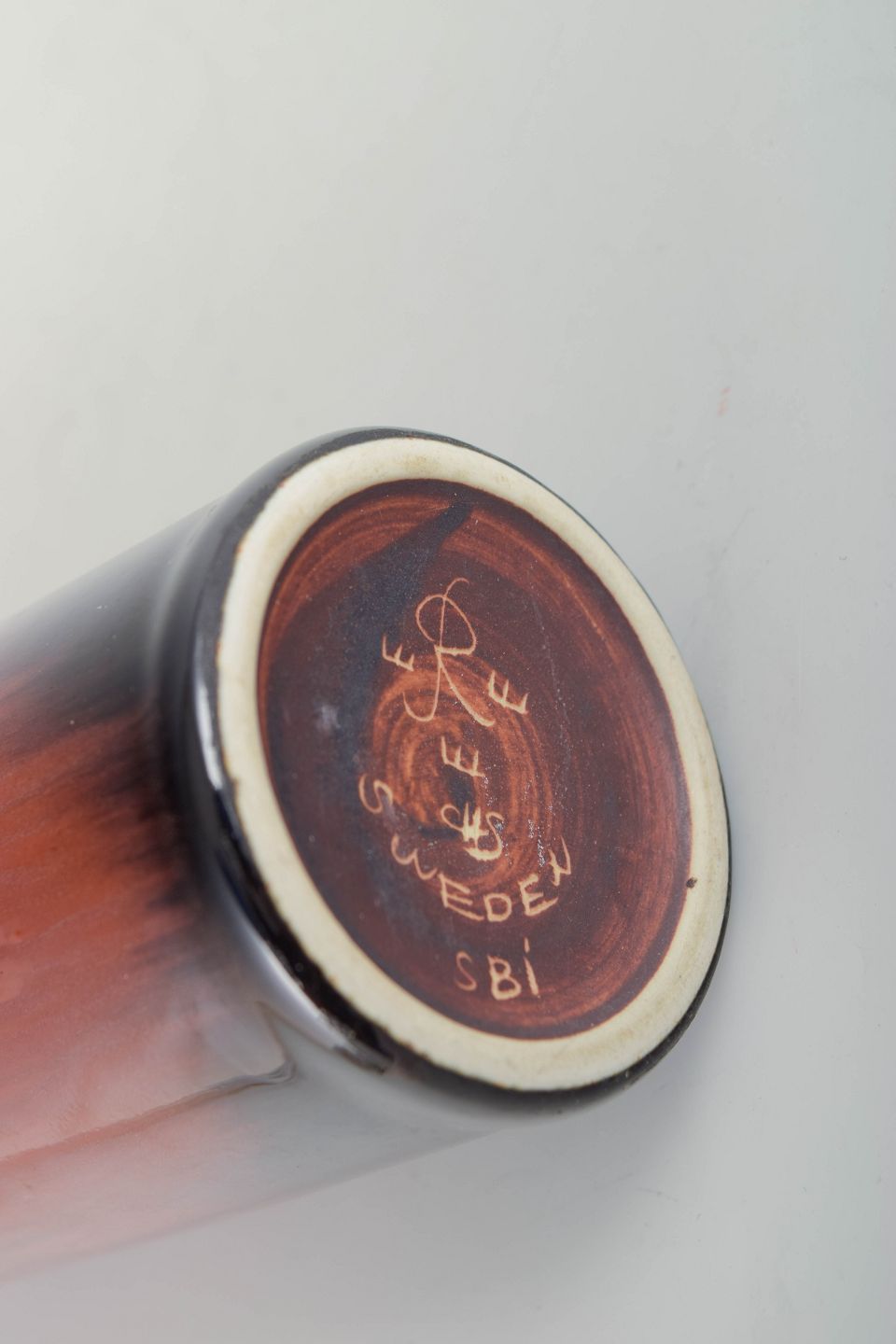 Cylindrisk vase i stentøj med afrundet skulder og udadbuet kant, dekoreret med rødbrun glasur med mørke løbende toner mod foden – et typisk eksempel på Stålhanes elegante formsprog og subtile glasurarbejde.