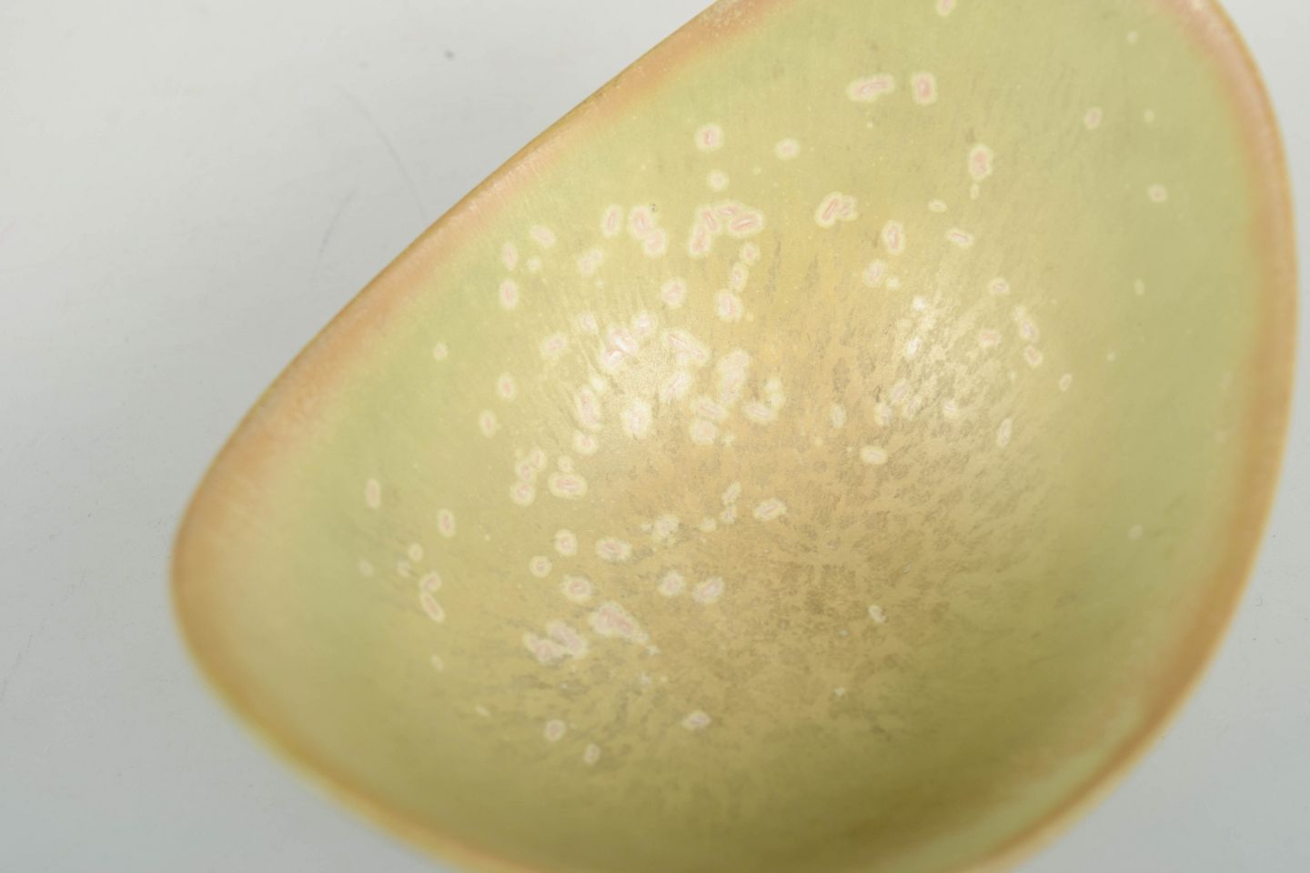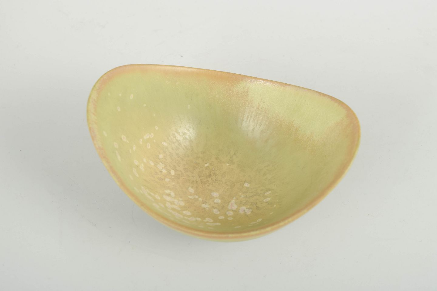Elegant organisk formet skål i stentøj med den karakteristiske æggeskalsglasur i lyse grønne og rosa toner.