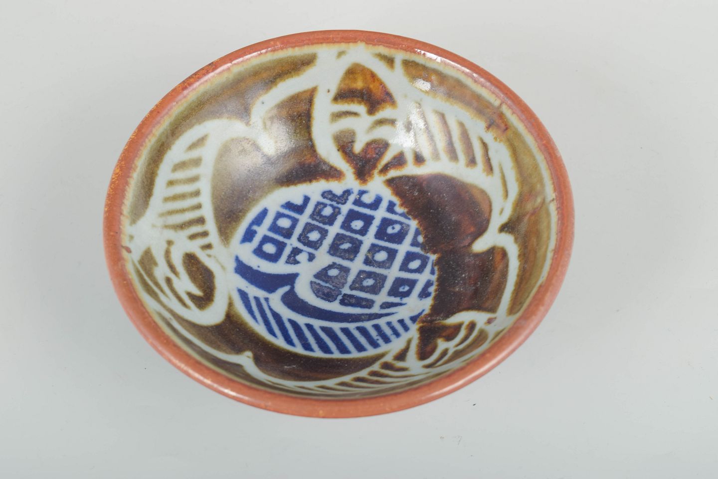 Unik skål i kinesisk-inspireret stil med dekorativ relief- og penselmalet dekoration samt lys celadonlignende glasur og rødlig kant. Signeret.
