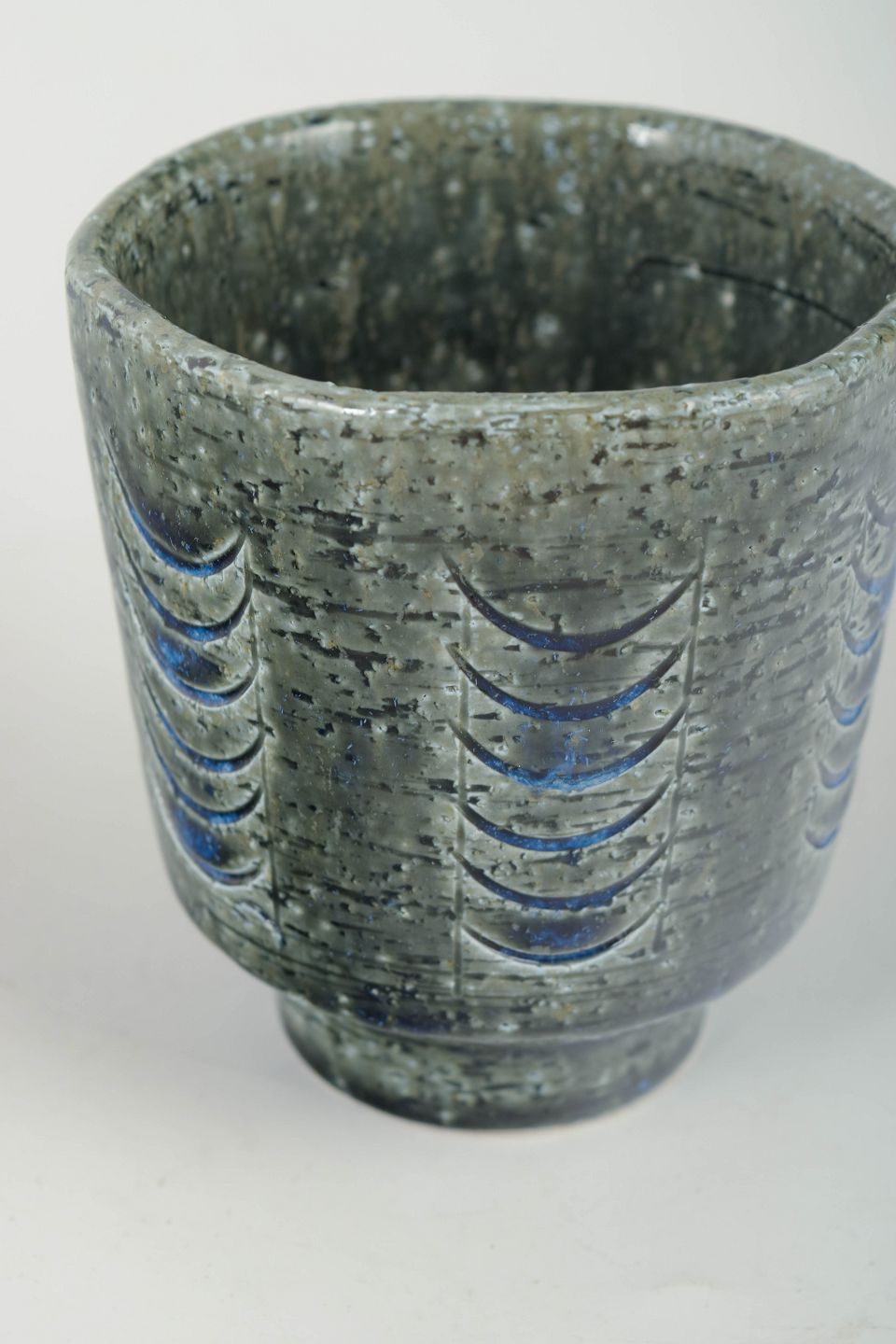Lille cylindrisk vase i stentøj med indskårne buemotiver i blå nuancer og karakteristisk Palshus askeglasur. Signeret.