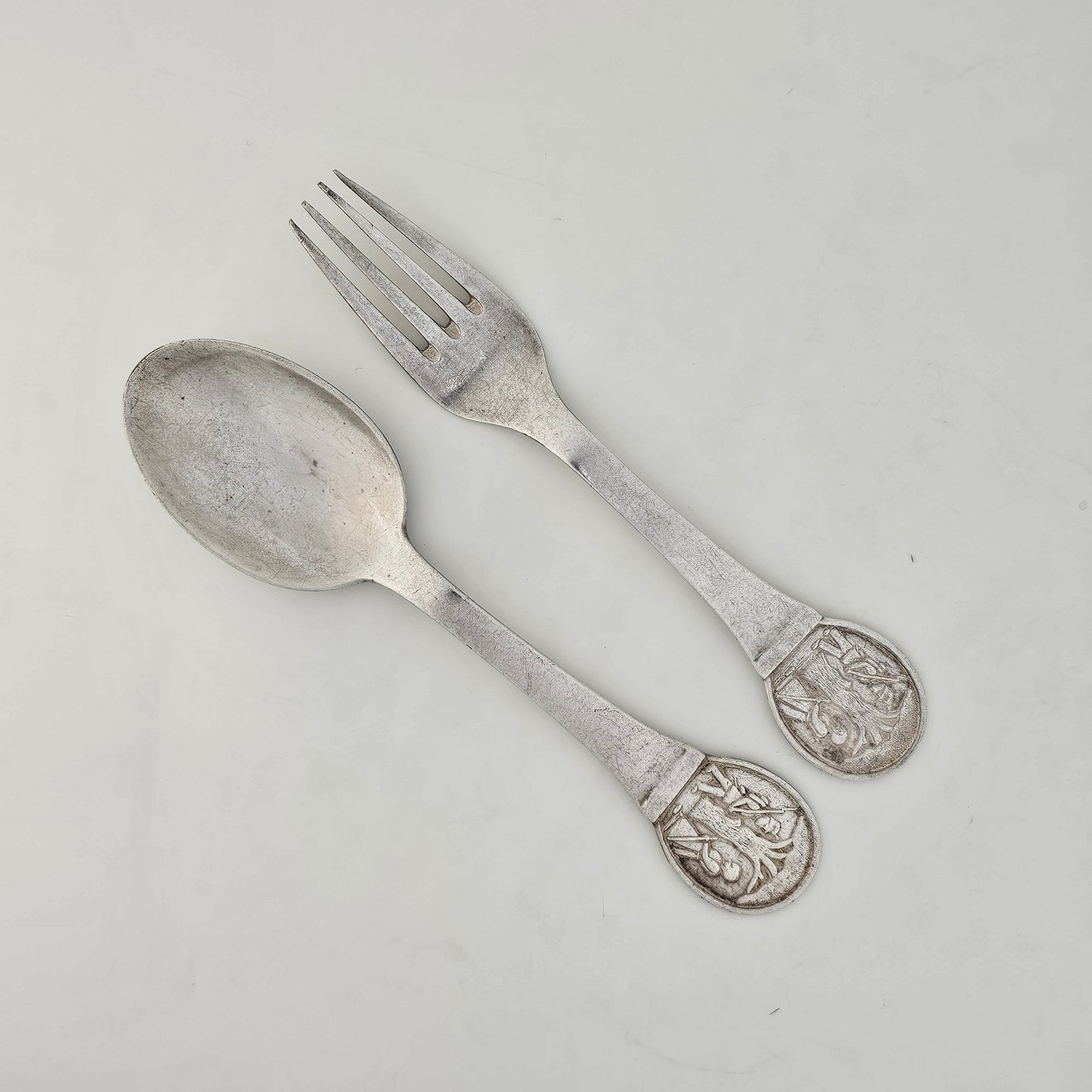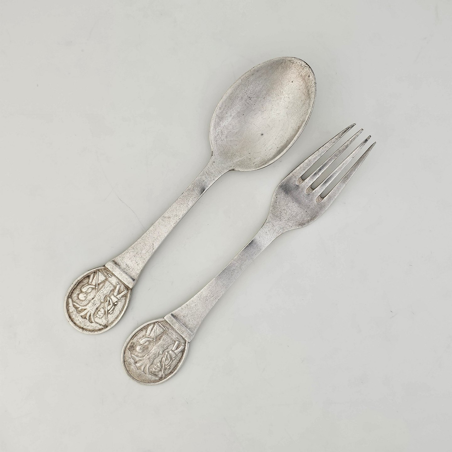 Gaffel og ske af pletsølv med motiv af H.C. Andersens Fyrtøjet