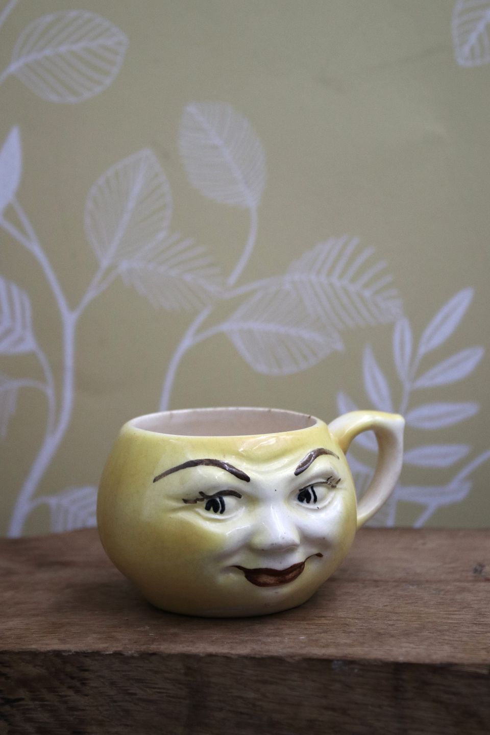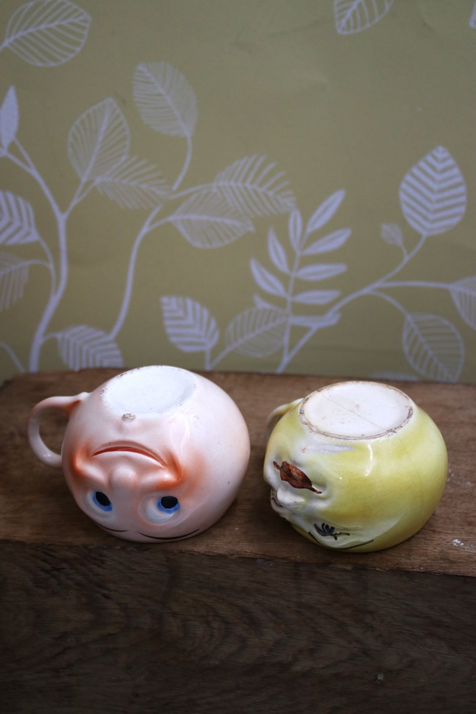 Gamle børnekopper i fajance med sjove ansigter.