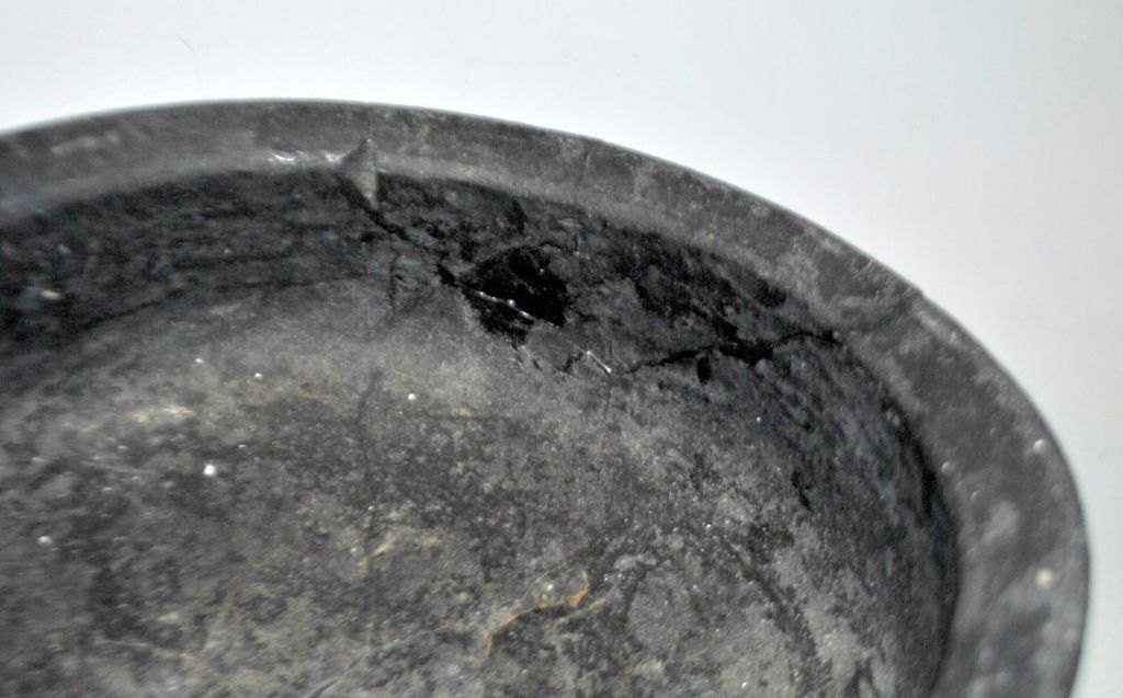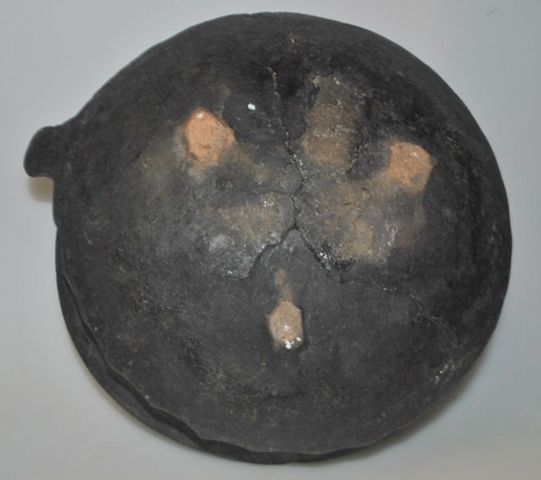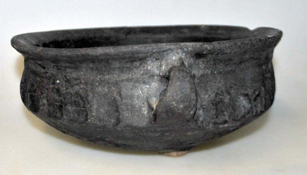 Keltisk jernalder, Øreskål. Danmark. Jordfund. Med dekoration på siderne. Sort ler. Med tre små ben. Repareret. Dia.: 22 cm. H: 9 cm.
