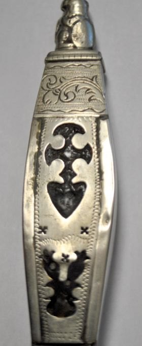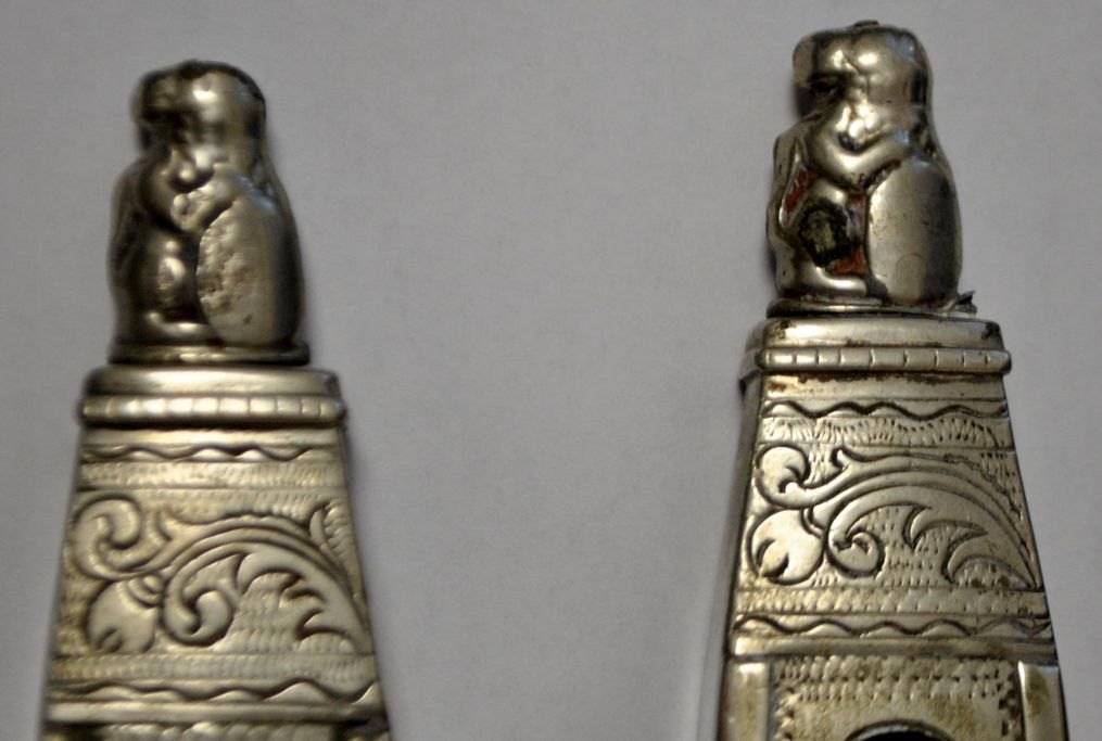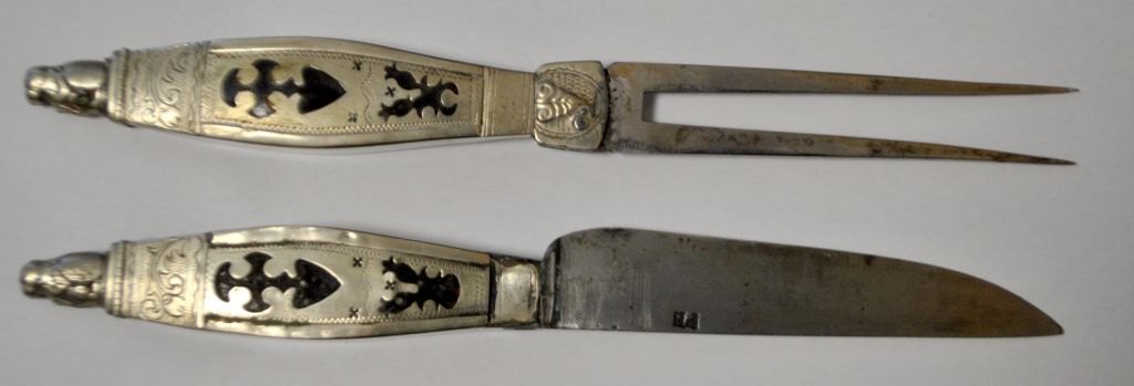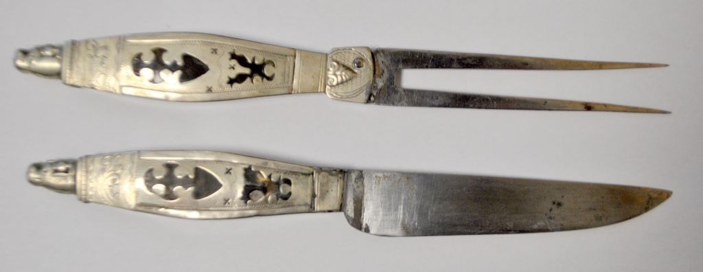 Hollandsk renaissance sølv bestik , 17. årh. Klinge af stål. Skæft med indlægninger af skildpadde. Øverst figur af løve med Amsterdams våbenskjold. L.: 22 cm. & 22,5 cm.
