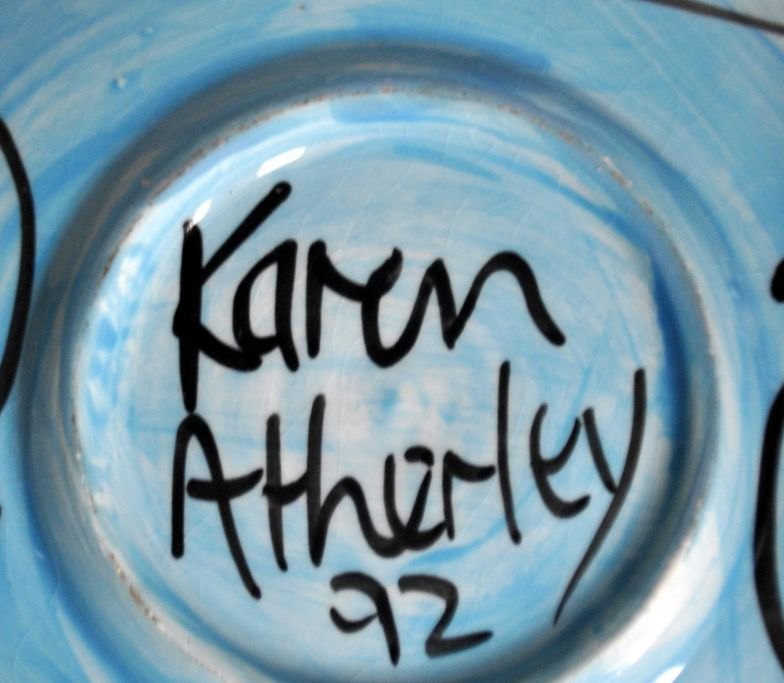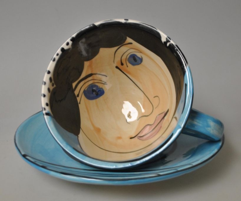 Atherley, Karen (1961 - ) England: Teacup with saucer. With glaze and decoration of a woman's face. Signed 1972. H.: 8 cm. Saucer diameter: 19 cm.