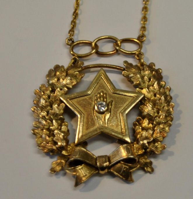 Danior, ApS, (efter 1991) København: Loge vedhæng. Forgyldt sølv. Vedhæng: 4,5 cm. Kædelængde: 60 cm. Stemplet. Med indgravering bagpå: 105, nr. 7.