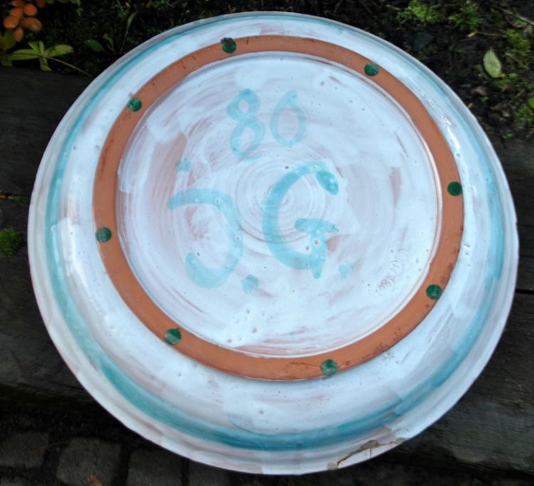 Glud, Jørgen (1913 - 2003) Danmark: keramik fad, 1980. Rødler. Glasur i sort, blå, hvid og grøn. Signeret: J.G. 80. Dia: 37 cm.