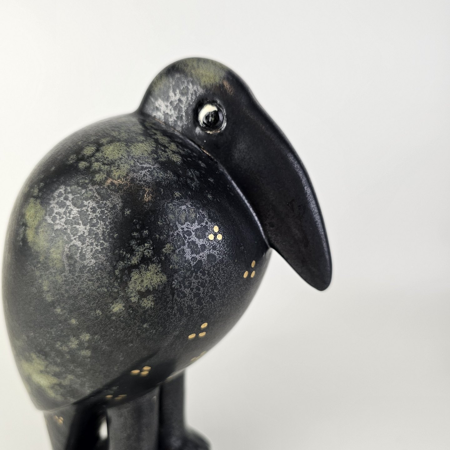 Figur i glaseret stentøj med motiv af en krage