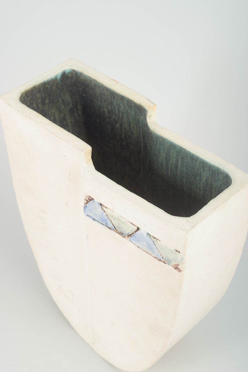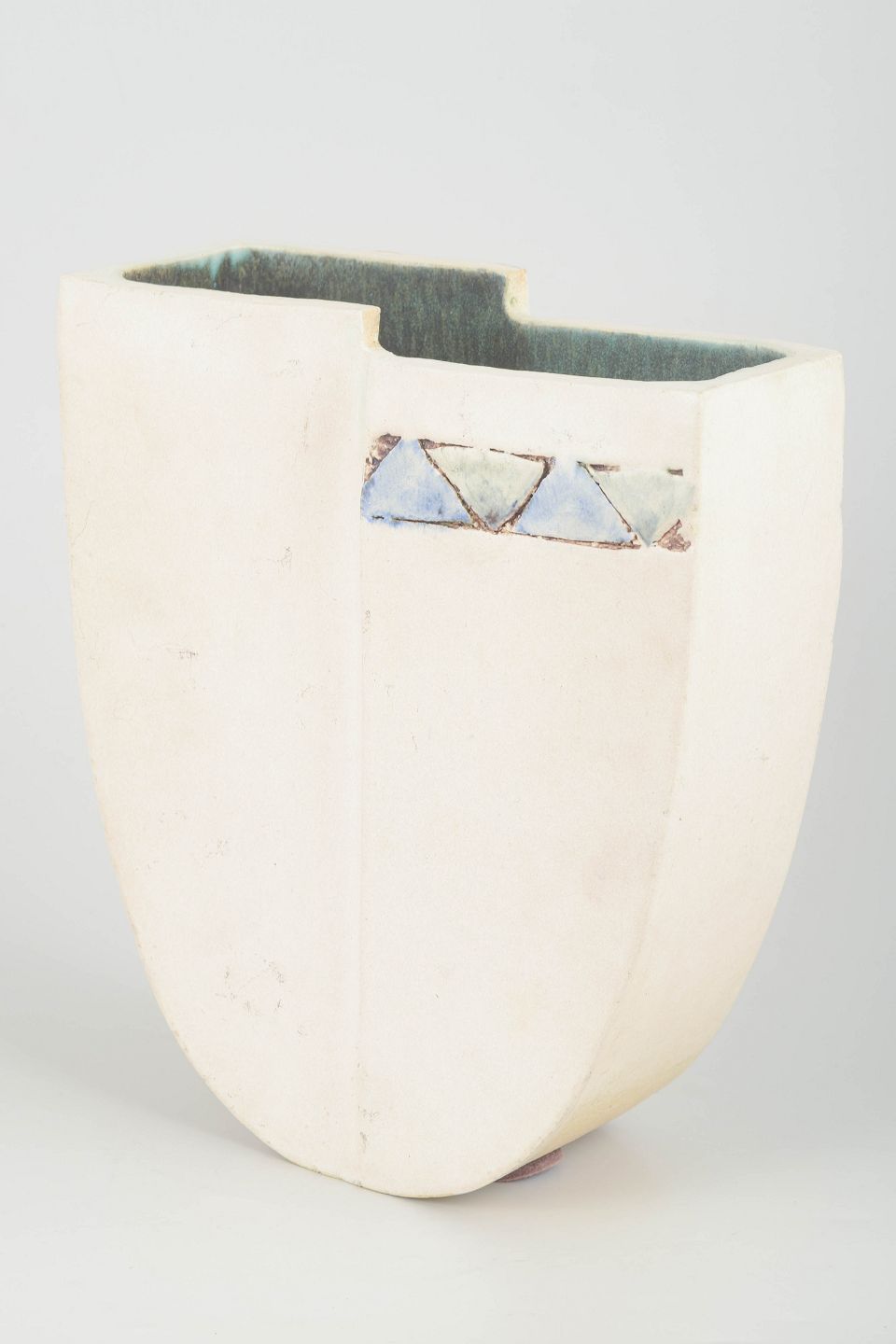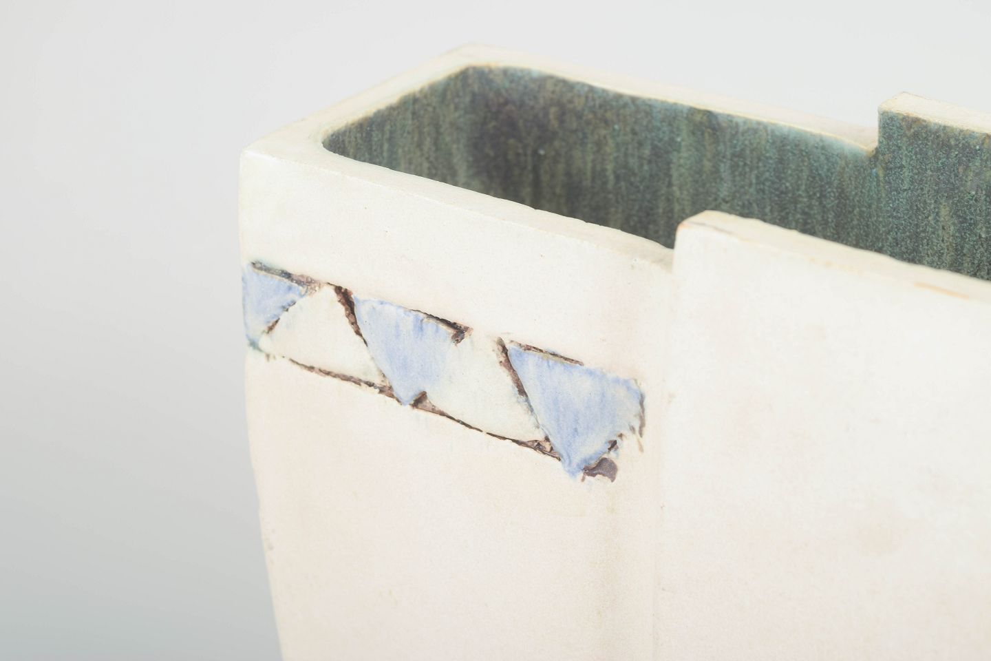 Skulpturelt formet vase i stentøj med rå, mat hvid overflade, lodrette planede flader og indvendig glasur i grønne nuancer. Dekoreret med et håndmalet trekantsbånd i blå og grå toner. Signeret.
