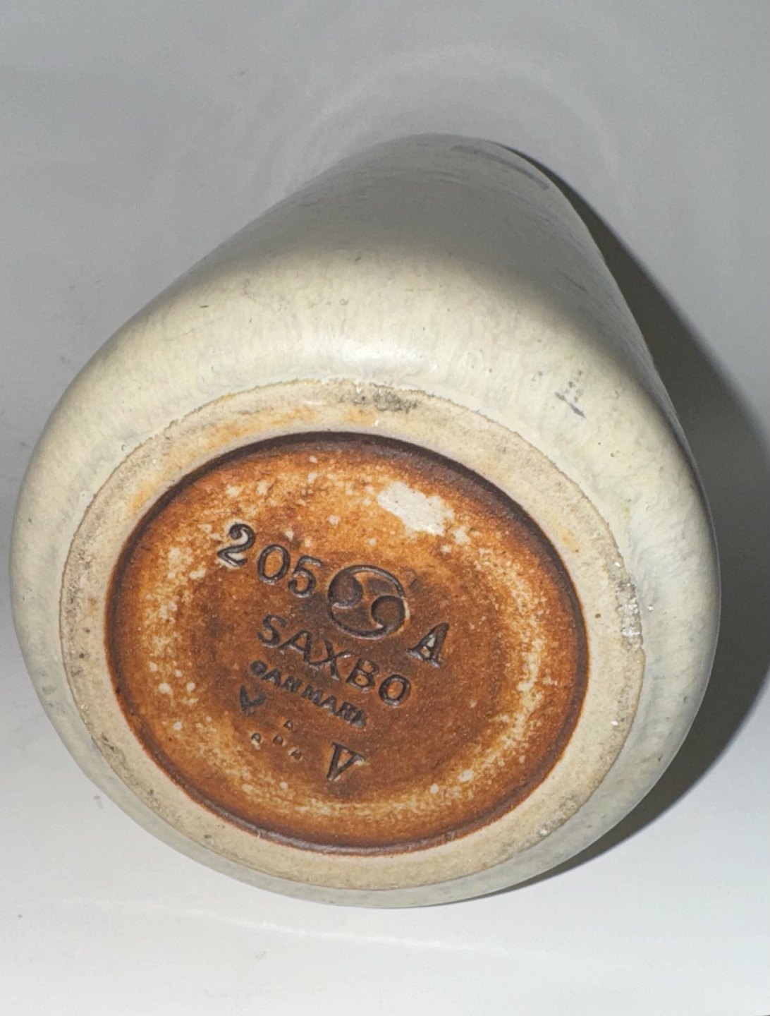 Keramik vase fra Saxbo. Dækket af en lys creme glasur. Fremstillet i Danmark omkring 1945. I god stand. Fabriksmærket på bunden. H. 18,5 cm