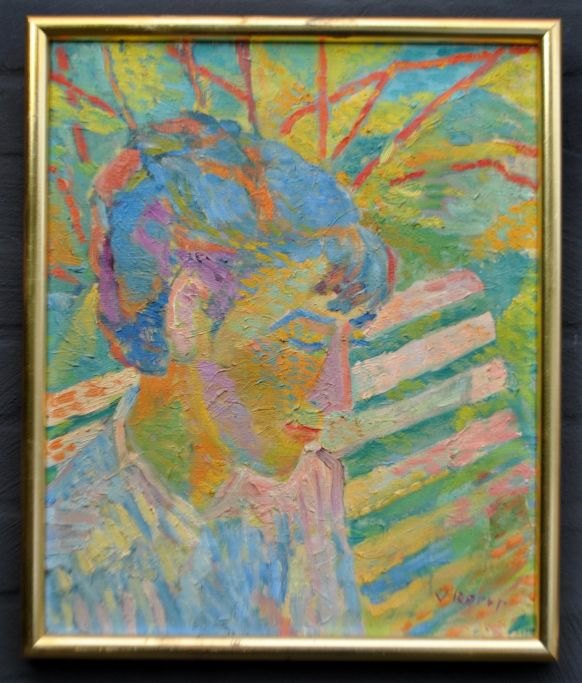 Rørup, Viggo Julius (1903 - 1971) Danmark: En kvinde på en bænk. Olie på lærred. Signeret. 38 x 30 cm. Indrammet: 49 x 41 cm.
