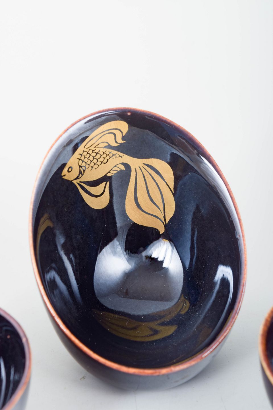 Tre små håndglaserede skåle i dyb blå glasur, hvoraf én dekoreret med et elegant guldfarvet fiskemotiv. Klassisk Gustavsberg-æstetik i miniatureformat.