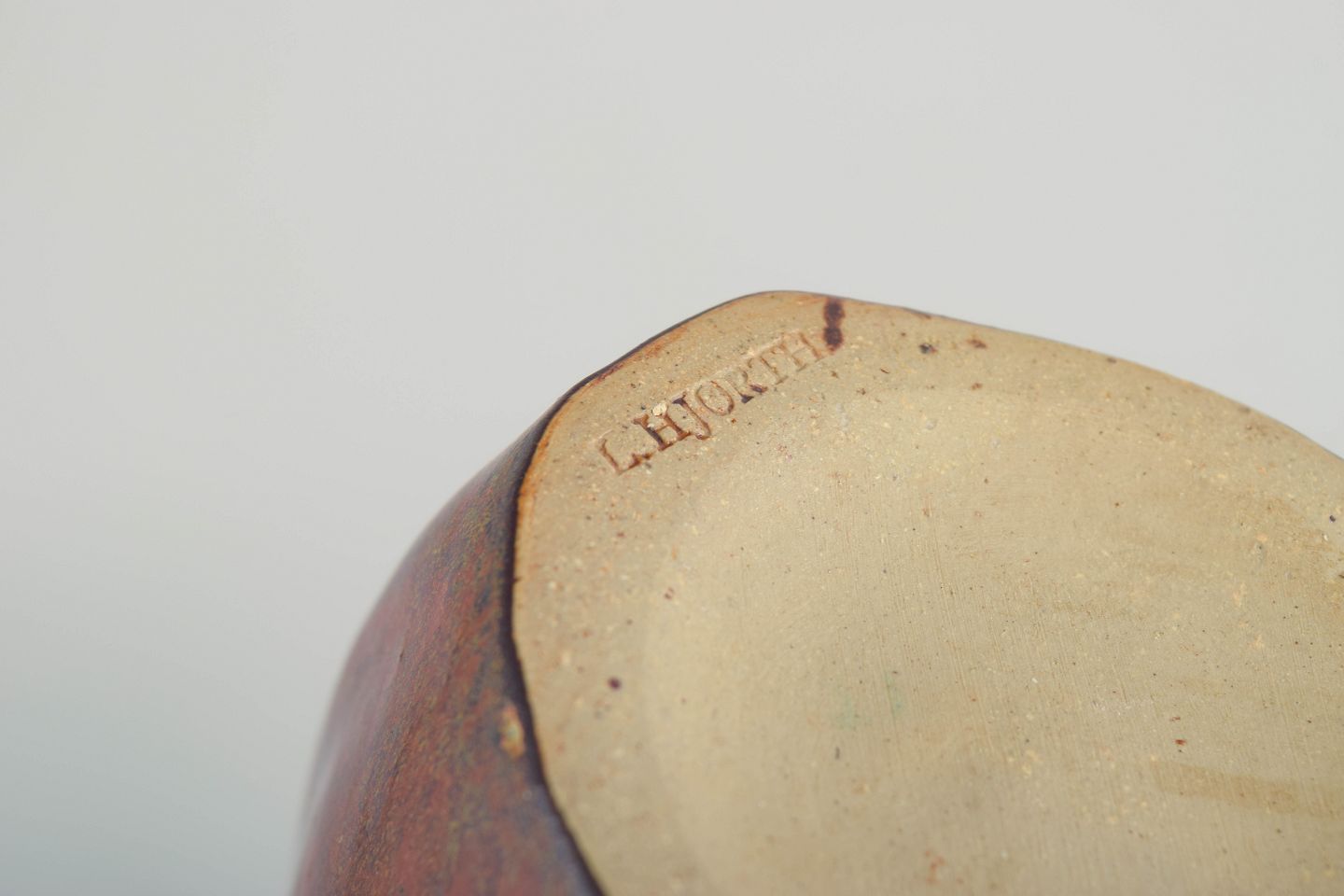Håndlavet stentøjsvase i karakteristisk triangulær form med blød, afrundet geometri. Udført i en dyb rødbrun reduktionsglasur, som fremhæver værkstedets raffinerede overfladespil og stramme formsprog.
