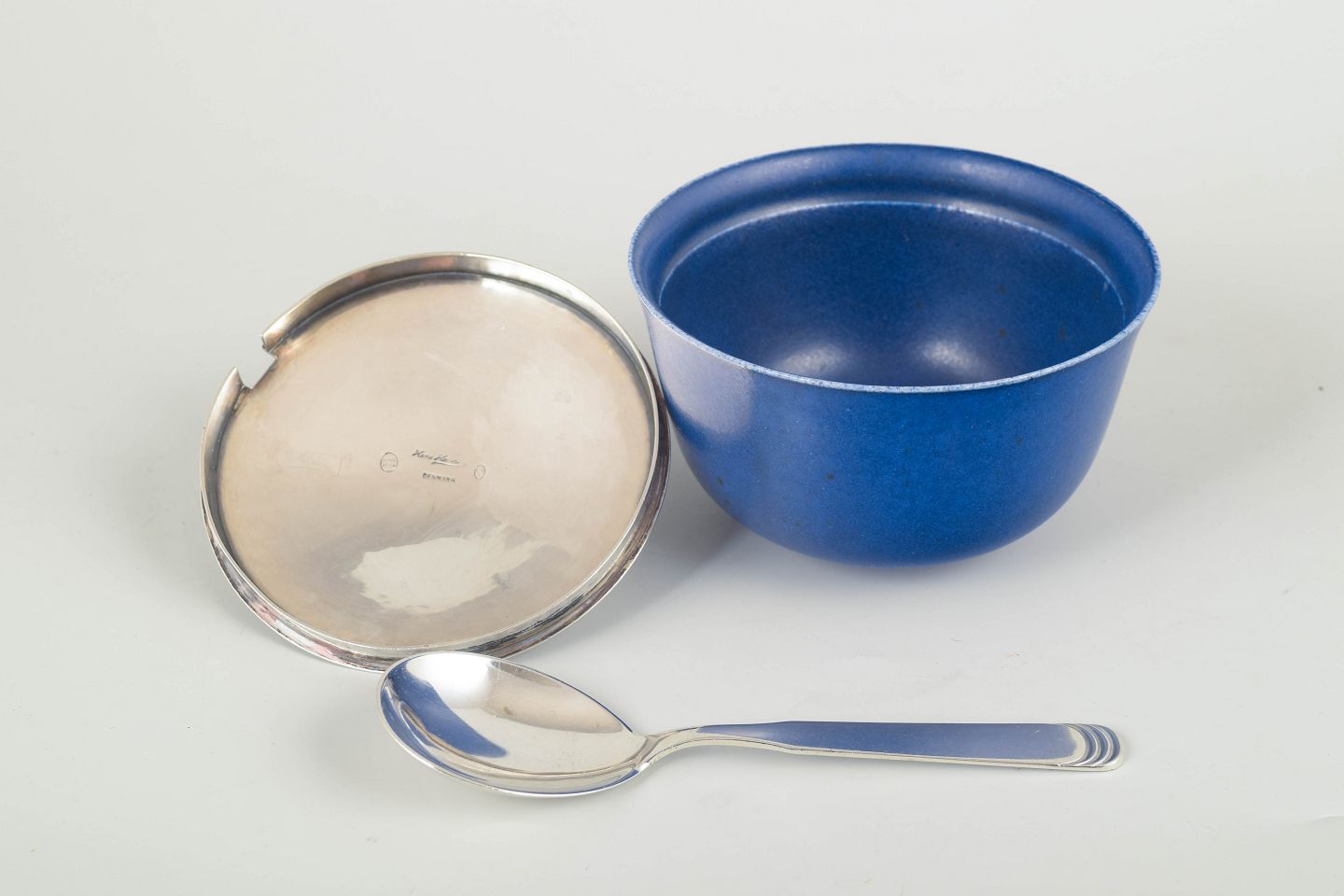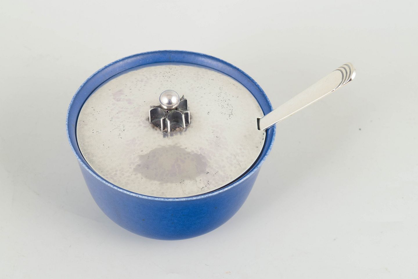 Elegant marmeladekrukke i klassisk Saxbo-stentøj med dyb blå glasur, Hans Hansen sterlingsølvlåg (1934) og Hans Hansen 830 sølvske.
