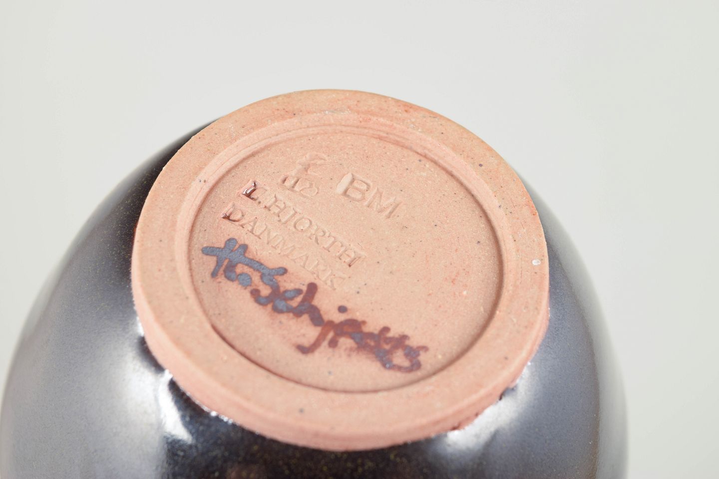 Hånddrejet stentøjsvase med elegant konisk profil, dækket af en dyb, mørk glasur med diskrete spil i overfladen. Et klassisk eksempel på Bornholmsk keramiktradition, hvor håndværk og enkle former går op i en harmonisk helhed.