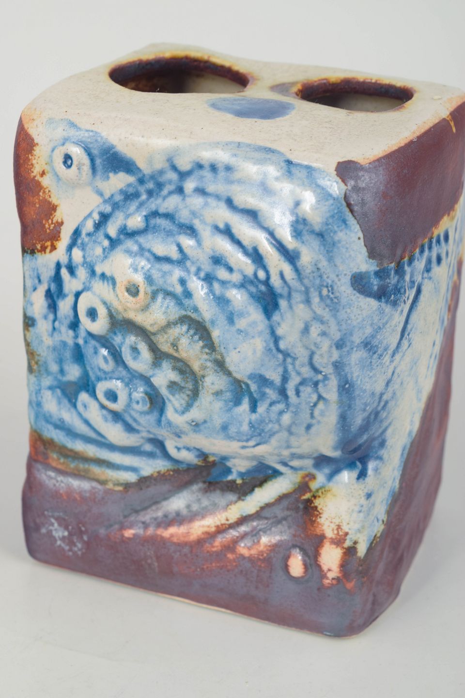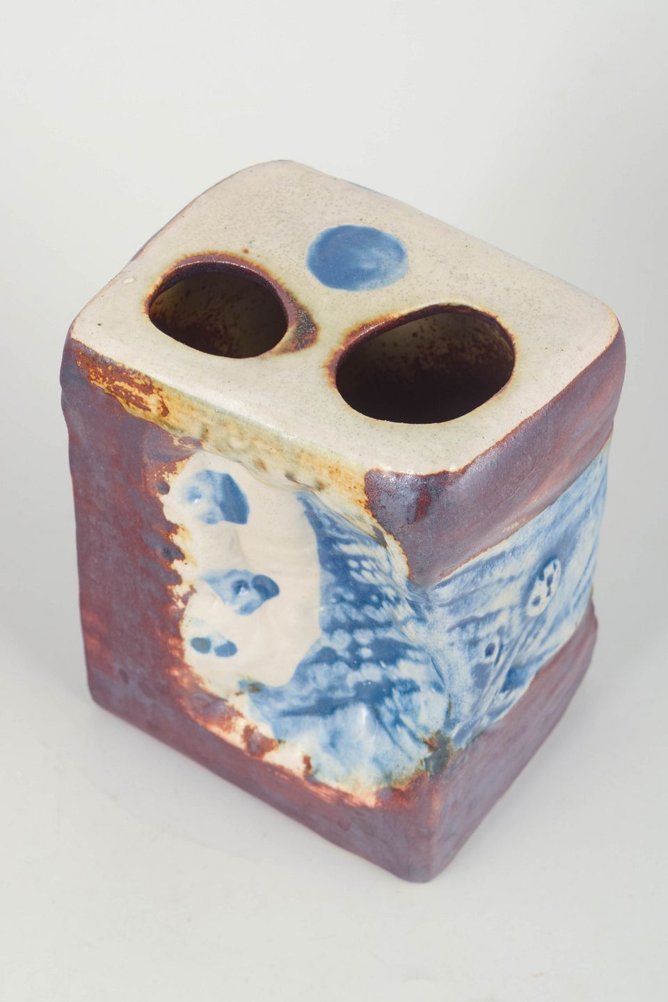Håndlavet, skulpturel vase i stentøj med kraftig brutalistisk form og eksperimenterende glasur i blå, hvide og jordtoner. De tre åbninger giver formen et arkitektonisk udtryk karakteristisk for Stålhane i Designhuset-perioden.