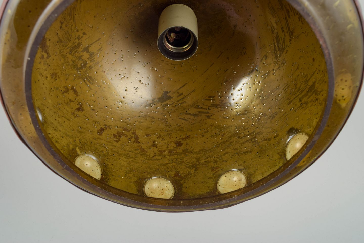 Skulpturel kobberpendel med karakteristisk patineret overflade og indlagte ravfarvede glaslinser rundt om skærmens kant.