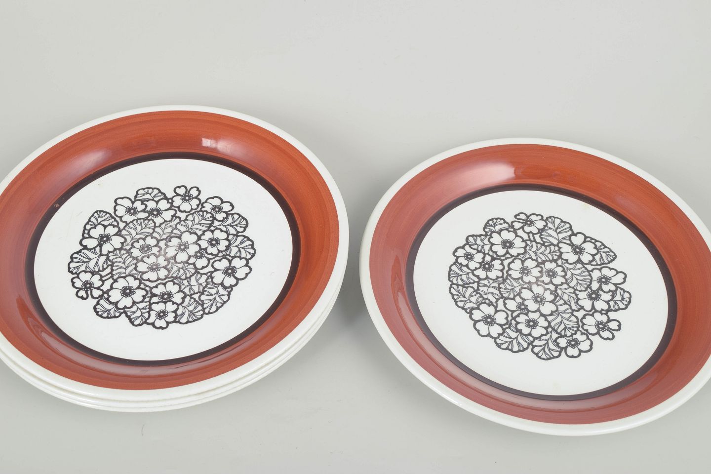 Sæt på 4 store stentøjstallerkener med den karakteristiske Agneta-dekoration: et grafisk blomsterfelt i sorte linjer omgivet af en varm rødbrun kant. Et klassisk 70’er-design fra Gefle med et både dekorativt og funktionelt udtryk.
