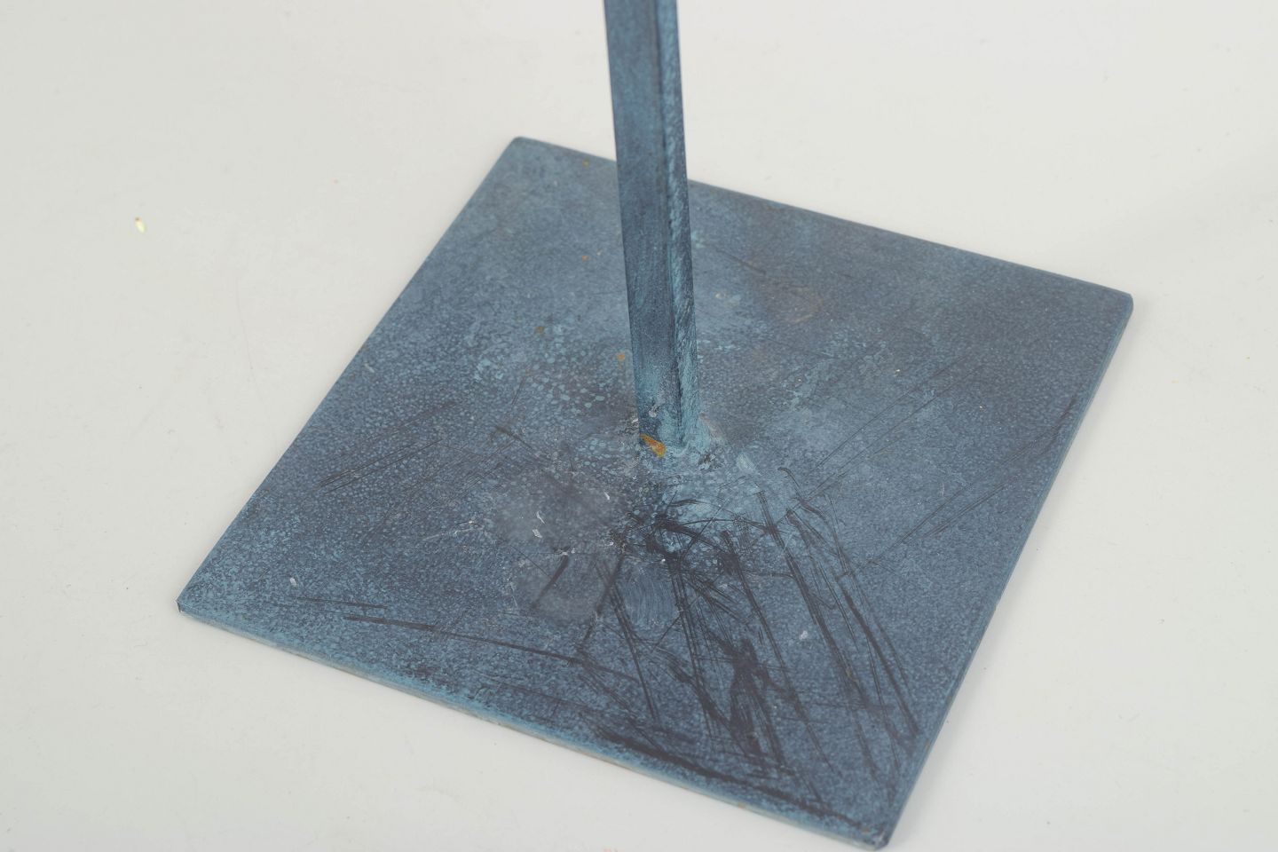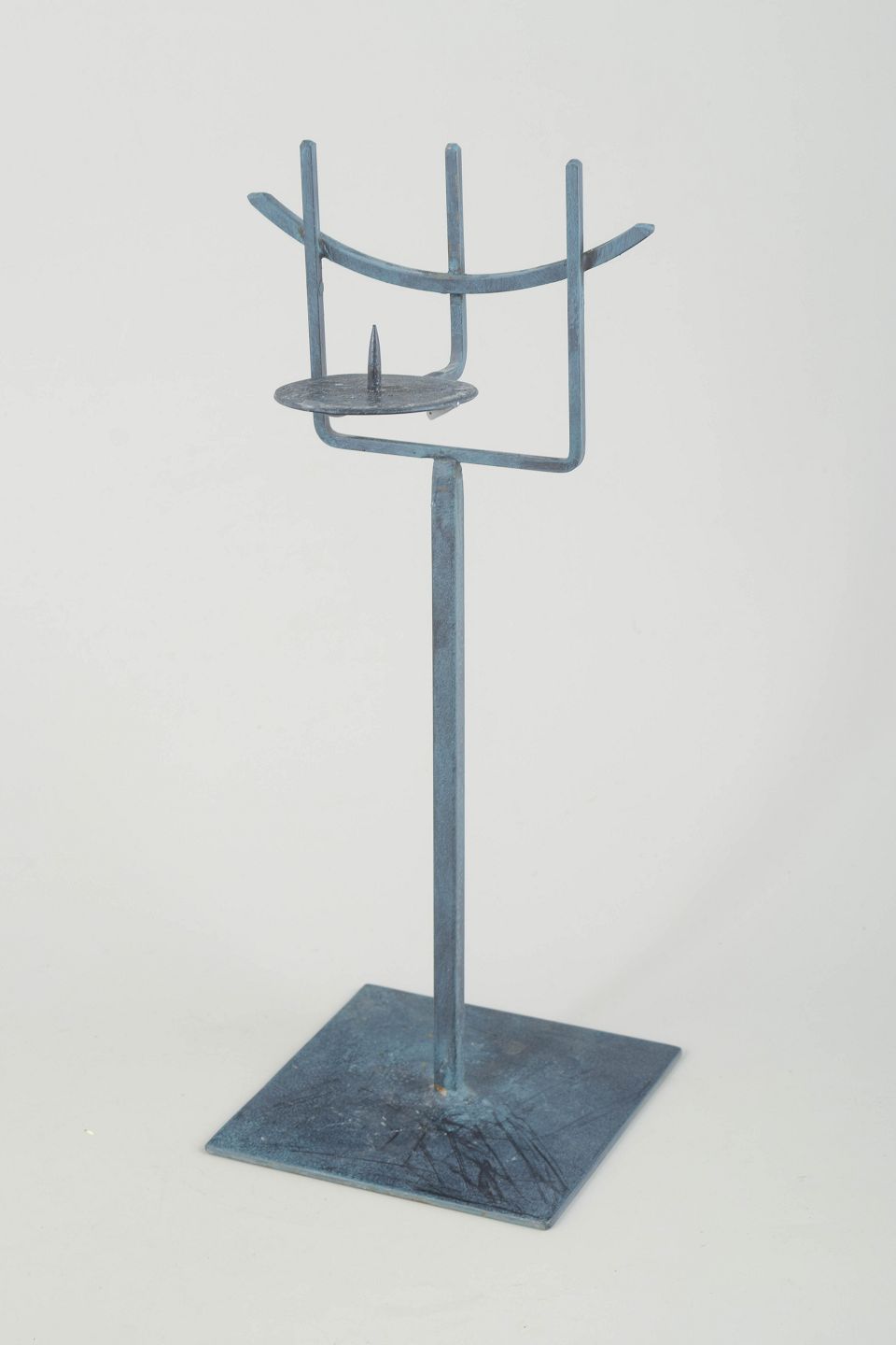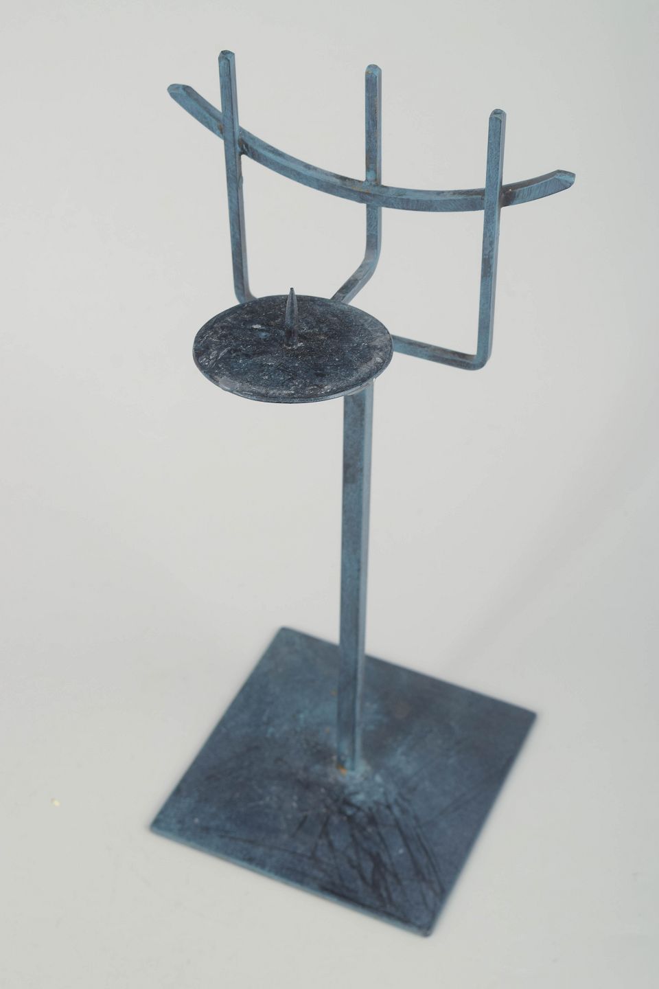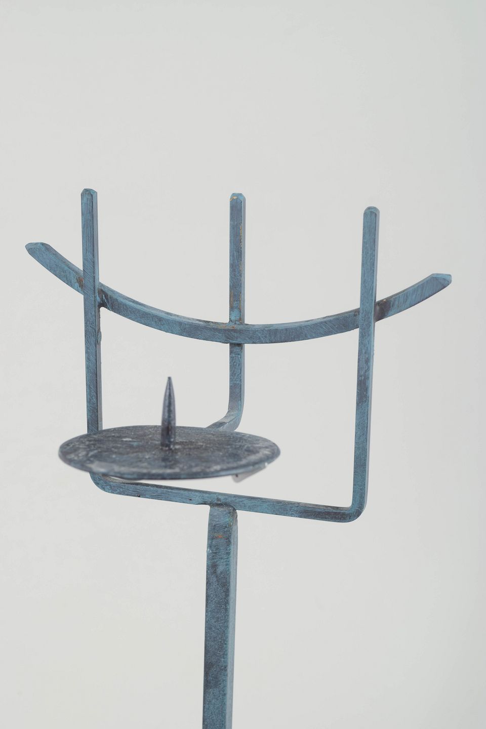 Skulpturelt, håndsmedet lysestage i patineret metal med Orloffs karakteristiske modernistiske formsprog. Den åbne, grafiske konstruktion og den høje, slanke silhuet giver et let, arkitektonisk udtryk.