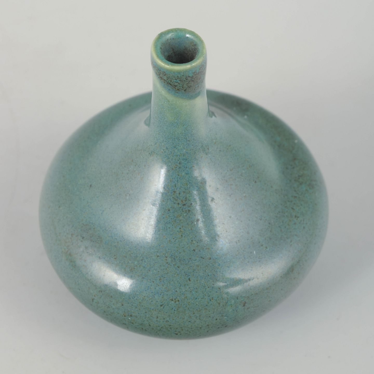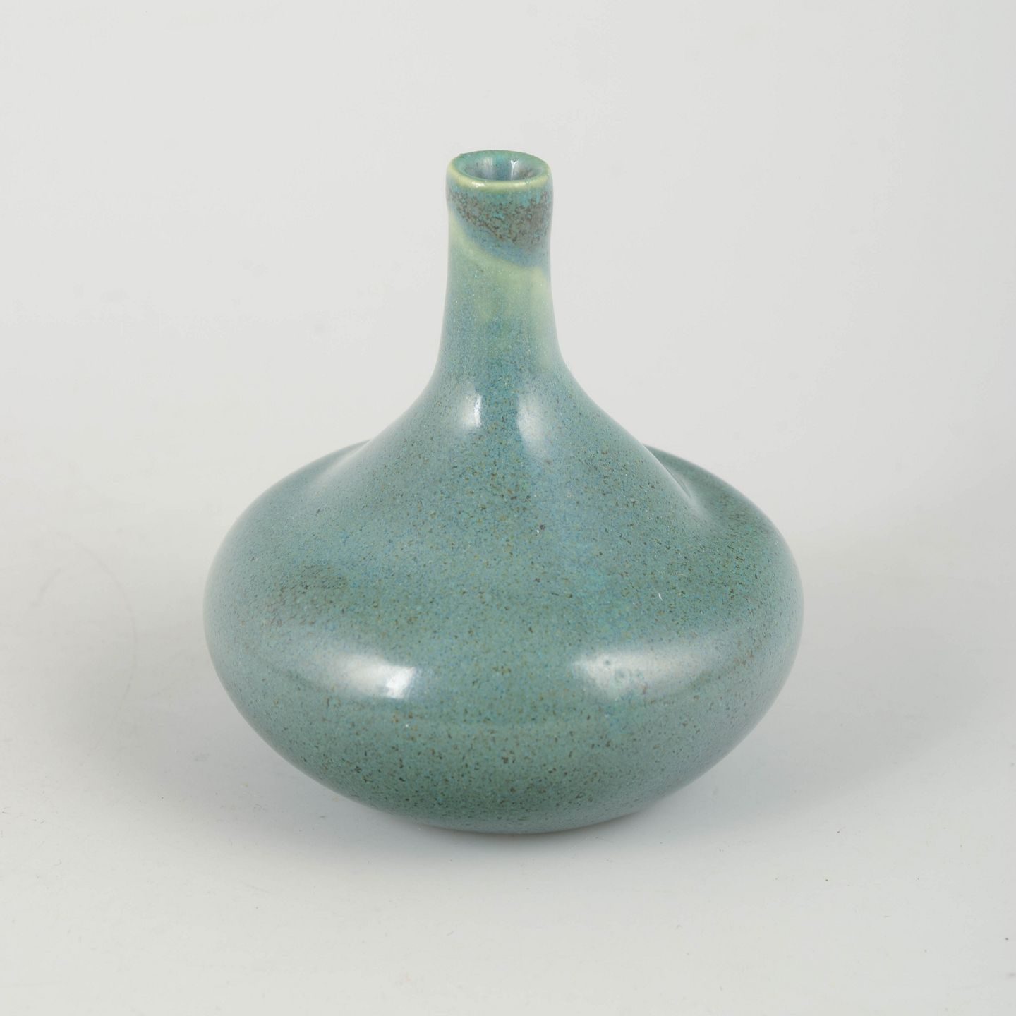 Small thrown stoneware vase with a rounded body and slender neck. The glaze features soft turquoise and green tones with subtle variation and transitions, characteristic of Scandinavian studio ceramics of the era. Signed Erik H. on the base.