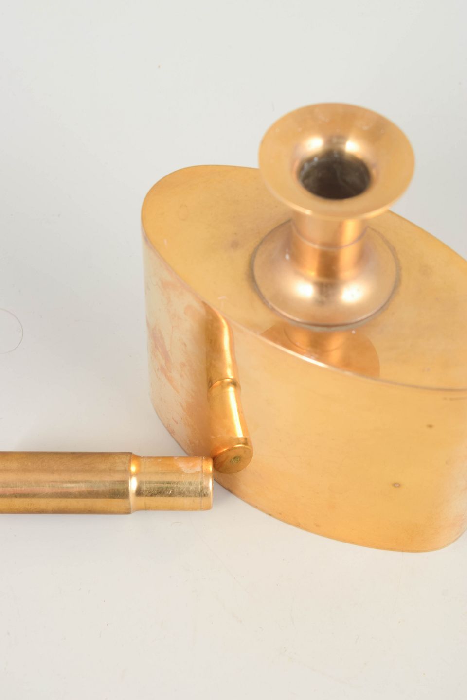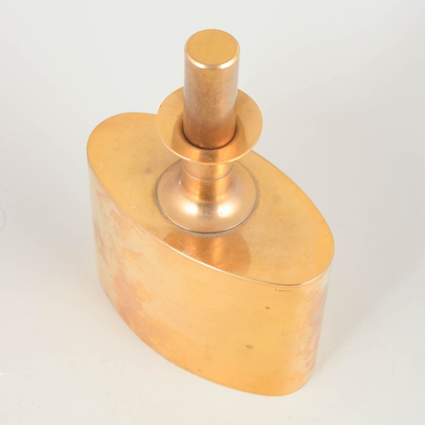 Elegant og skulpturel Lommelærke i messing, 23 karat guldbelagt, designet af Pierre Forssell for Skultuna. Den karakteristiske ovale krop og det stramt geometriske låg viser Forssells raffinerede modernistiske formsprog.