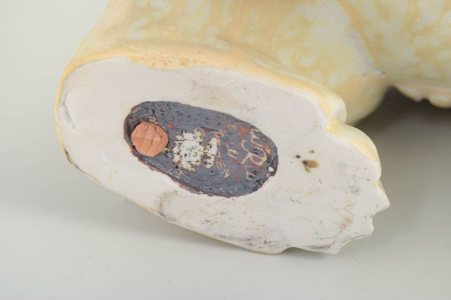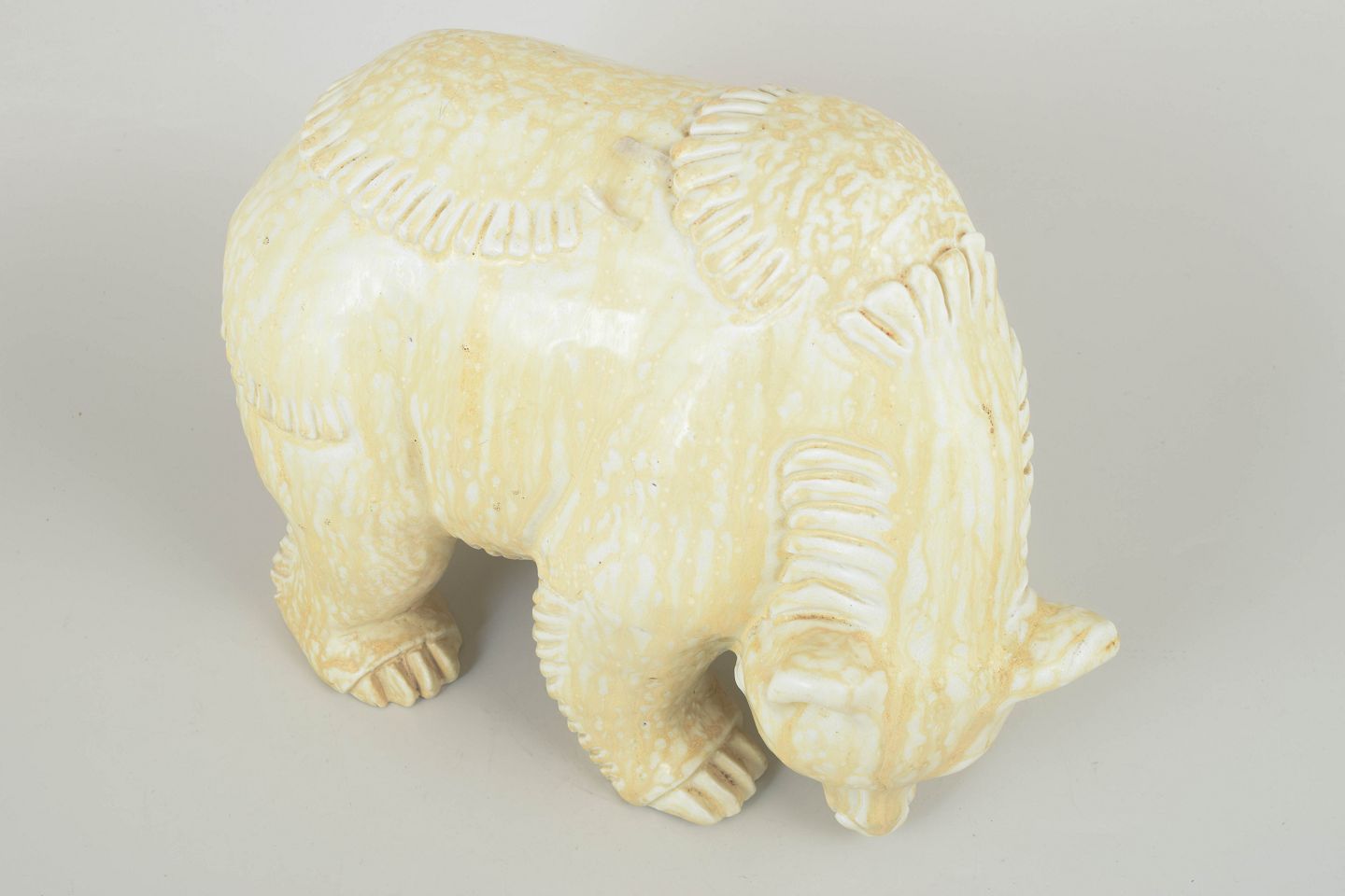 Meget stor figur i glaseret stentøj, formet som en nedadvendt, søgende isbjørn i Nylunds karakteristiske bløde, organiske stil. Den lyse glasur fremhæver den modellerede pelsstruktur og dyrets rolige tyngde.