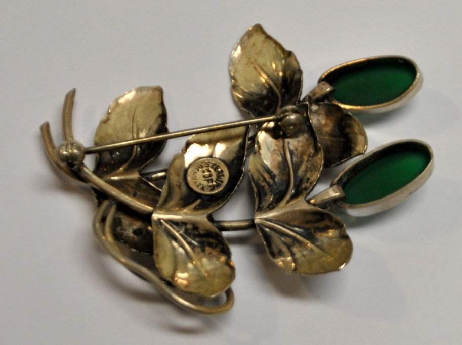 Karin Borup, Købehavn - Birkerød (2010 - ): Brosche i sterlingsølv. Med to grønne sten. Stemplet: COP. 6 x 5 cm.