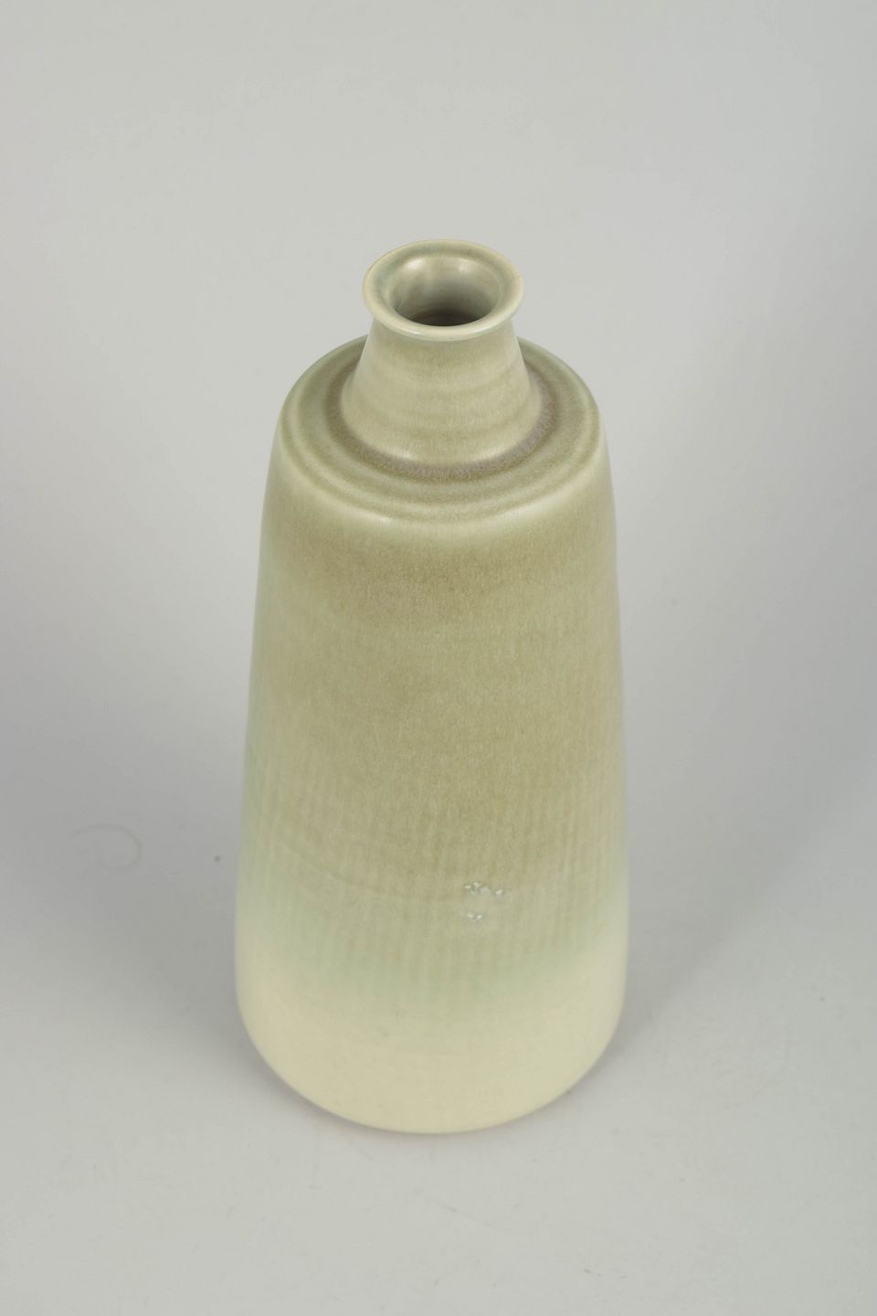 Elegant cylindrisk vase i stentøj med den karakteristiske harepels-glasur i bløde beige- og cremenuancer. Den matte, let levende overflade og den slanke form er typisk for Søholms produktion i 1970’erne.