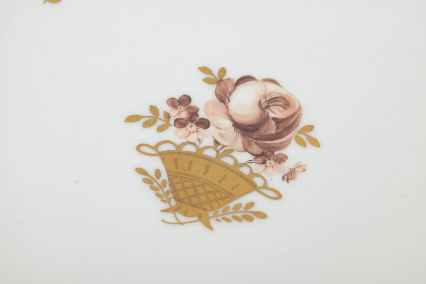 Stort og elegant serveringsfad i porcelæn fra Royal Copenhagens “Guldkurv”-serie, model 595/9047. Udført med bred forgyldt kant og det klassiske håndmalede blomsterkurvmotiv i centrum.