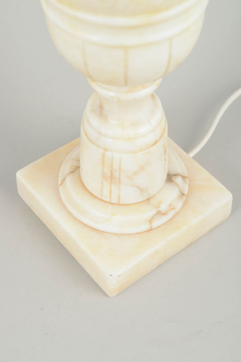 Dekorativ bordlampe i lys marmor med udskårne diamant- og lodrette facetmønstre, der giver lampen et klassisk og elegant formsprog. Den kvadratiske fod og de bløde proportioner understreger lampens skulpturelle karakter.