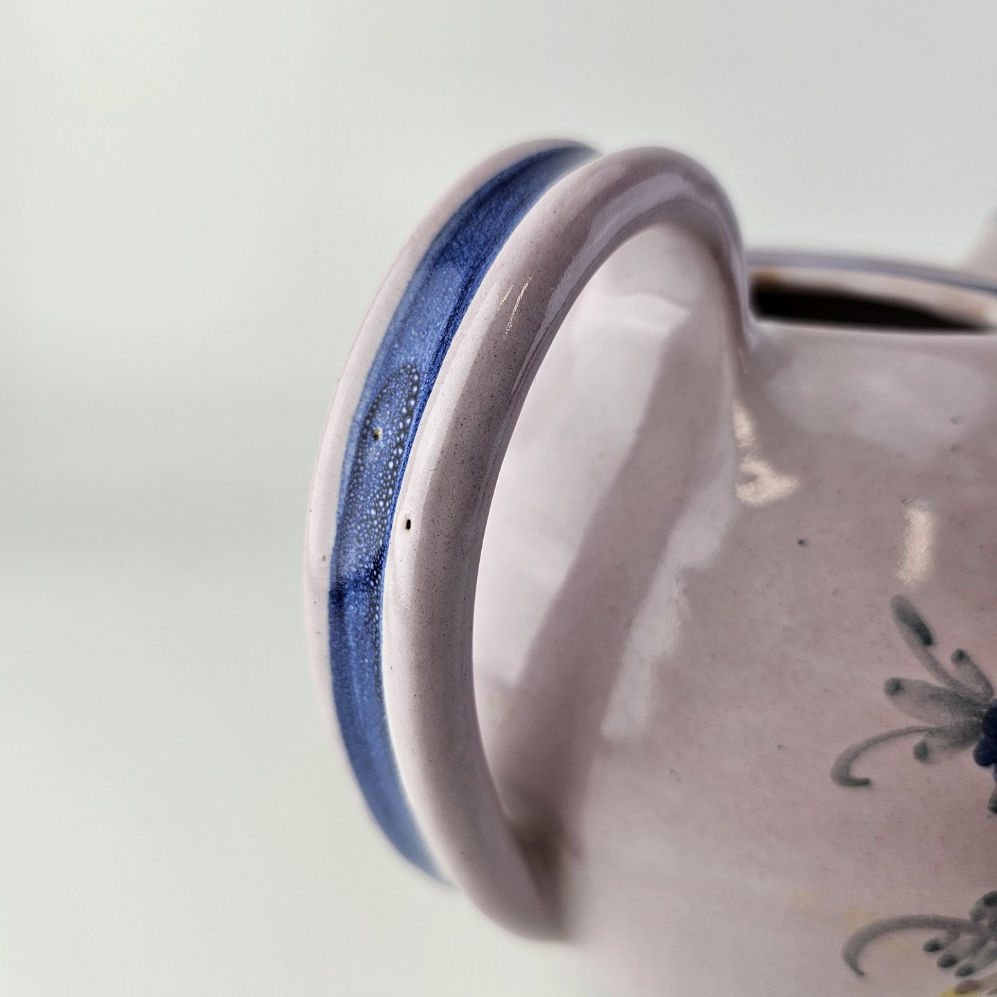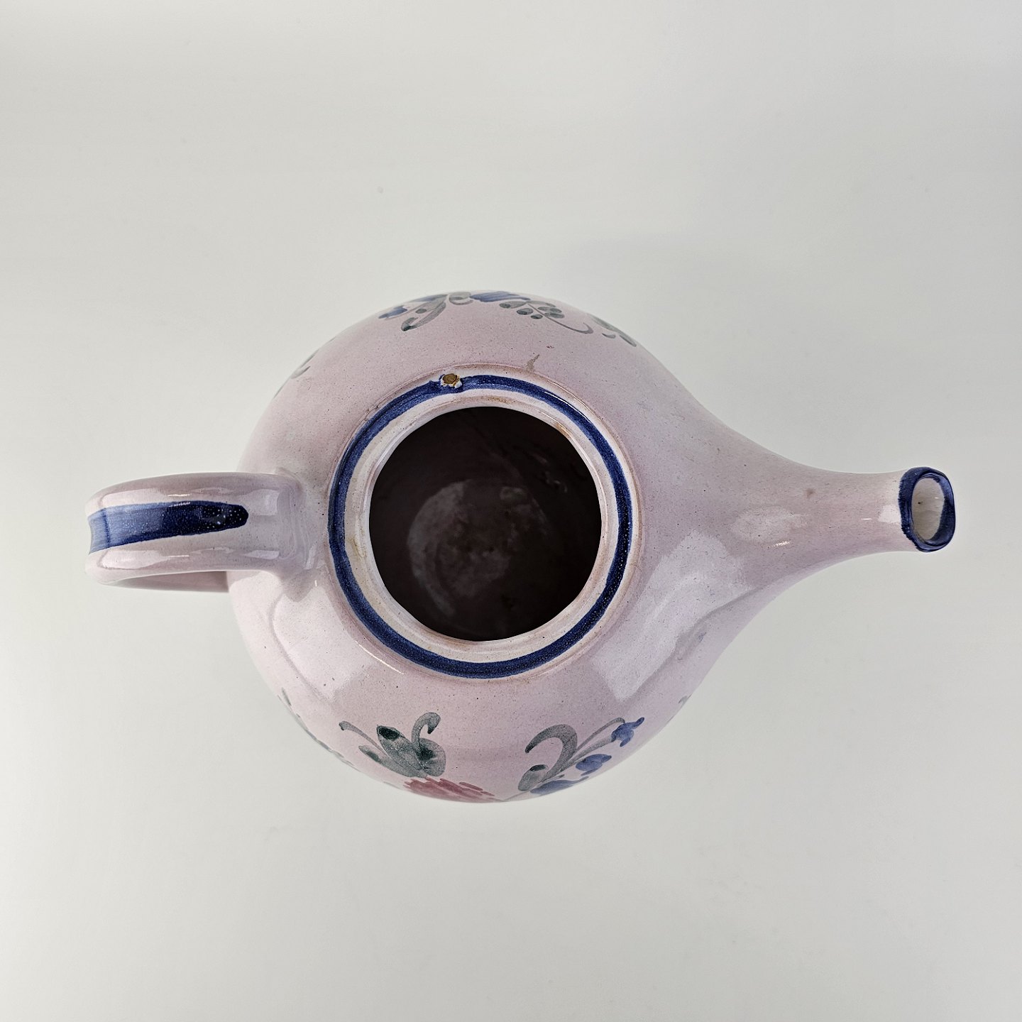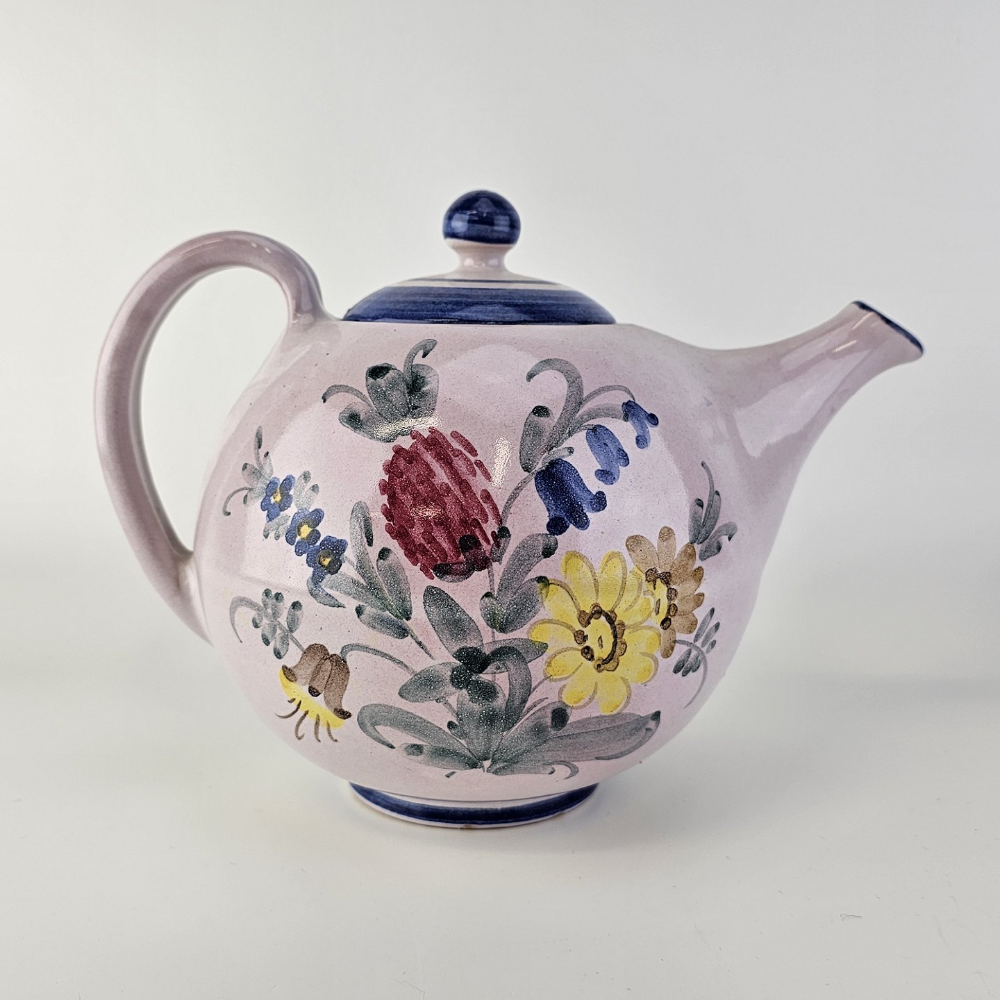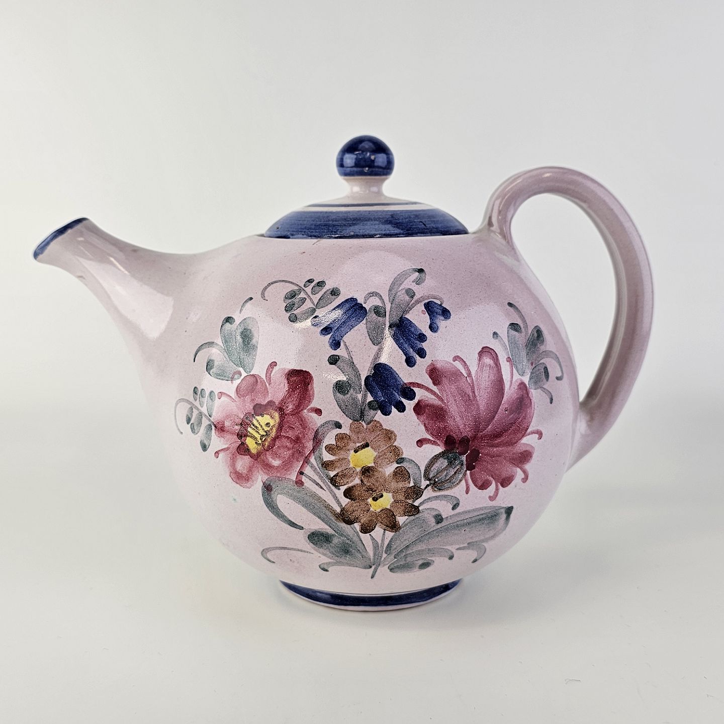 Håndlavet tekande i keramik. Rosa med blå detaljer og blomsterdekoration